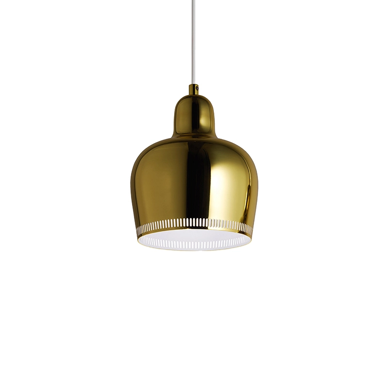 Dubbed the "Golden Bell", the suspension A330S has a sculptural quality that can be appreciated whether the light is on or off. With its golden reflections, the perforated edge of the A330S suspension light creates a memorable halo effect and prevents glare. Crafted from a single piece of brass or steel, the elegant "Golden Bell" was created by Aino and Alvar Aalto for the interior of The Savoy restaurant in Helsinki in 1937 and was subsequently displayed in the Finnish pavilion at the Paris World Fair the same year. Edited by Artek, the "Golden Bell" suspension embodies the clean aesthetic characteristic of Alvar Aalto, while the light it provides is both warm and diffused.