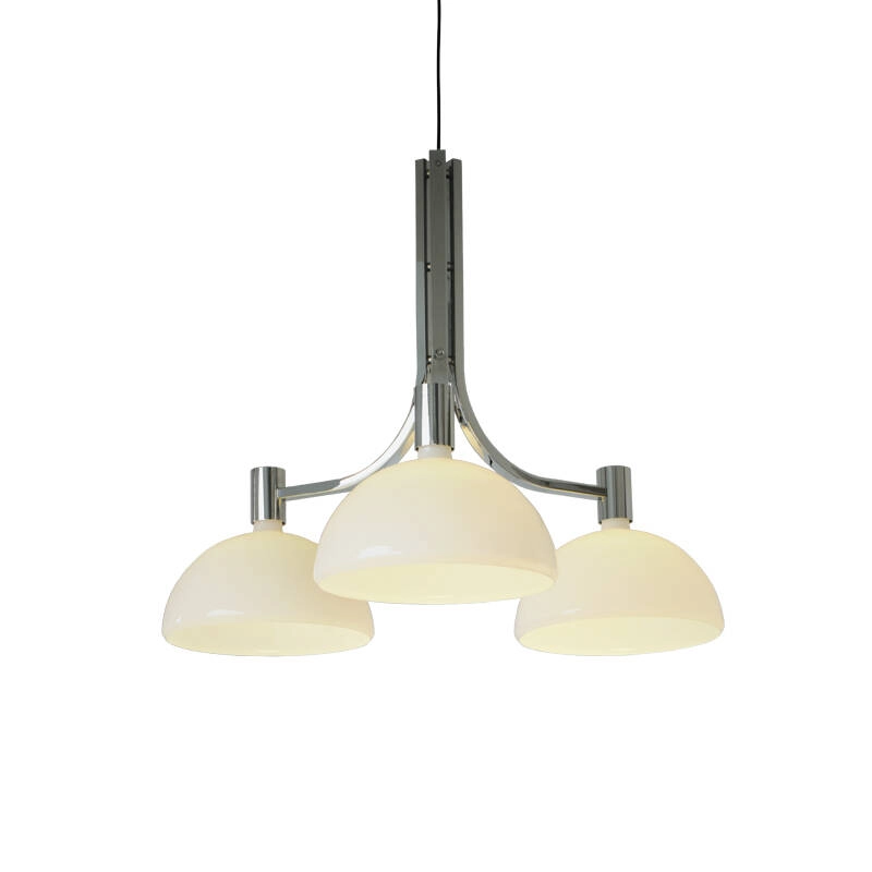 Albini AS43C is a suspension lamp with a chromed metal structure. Its half-moon-shaped diffusers are made from white opal glass. The light emission of the Albini AS43C suspension lamp is particularly diffused, ideal for illuminating interiors with elegance.