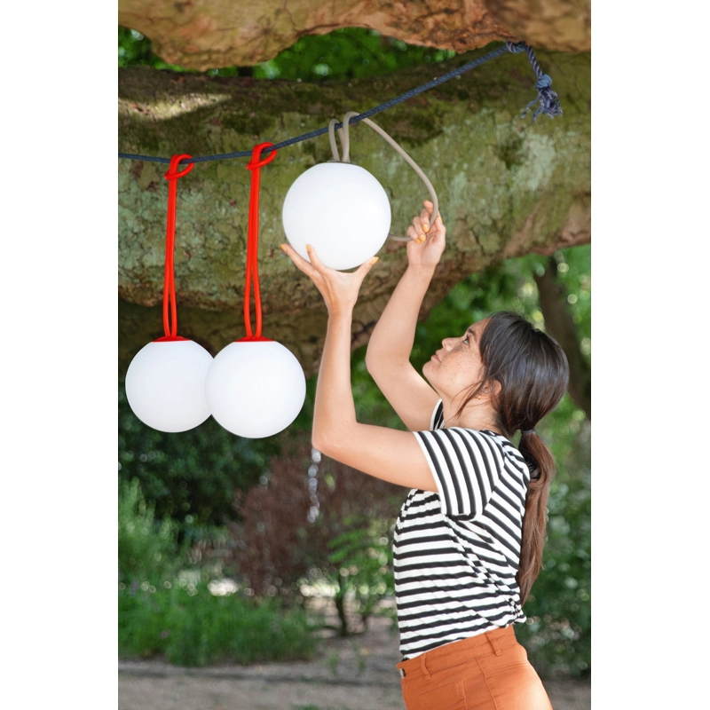 Bolleke is a cordless, portable and rechargeable lamp to light up wherever you are! Its design makes the most of all its components. For example, when lit, its rounded shape makes it look like a pearl. The regular contours of the Bolleke allow even brightness in any location. The light is distributed evenly throughout the lamp, a technology specially designed by Fatboy. The silicone rubber buttons are subtly integrated into the design and match the colour of the buckle, which takes its inspiration from hair elastics and sail fastening systems. Tying Bolleke is as simple as tying your hair back. With three different luminosities, the playful Bolleke luminaire knows how to stand out.