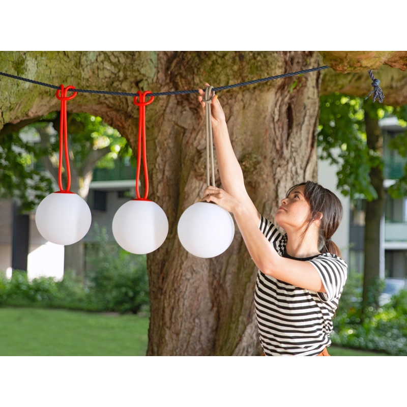 Bolleke is a cordless, portable and rechargeable lamp to light up wherever you are! Its design makes the most of all its components. For example, when lit, its rounded shape makes it look like a pearl. The regular contours of the Bolleke allow even brightness in any location. The light is distributed evenly throughout the lamp, a technology specially designed by Fatboy. The silicone rubber buttons are subtly integrated into the design and match the colour of the buckle, which takes its inspiration from hair elastics and sail fastening systems. Tying Bolleke is as simple as tying your hair back. With three different luminosities, the playful Bolleke luminaire knows how to stand out.