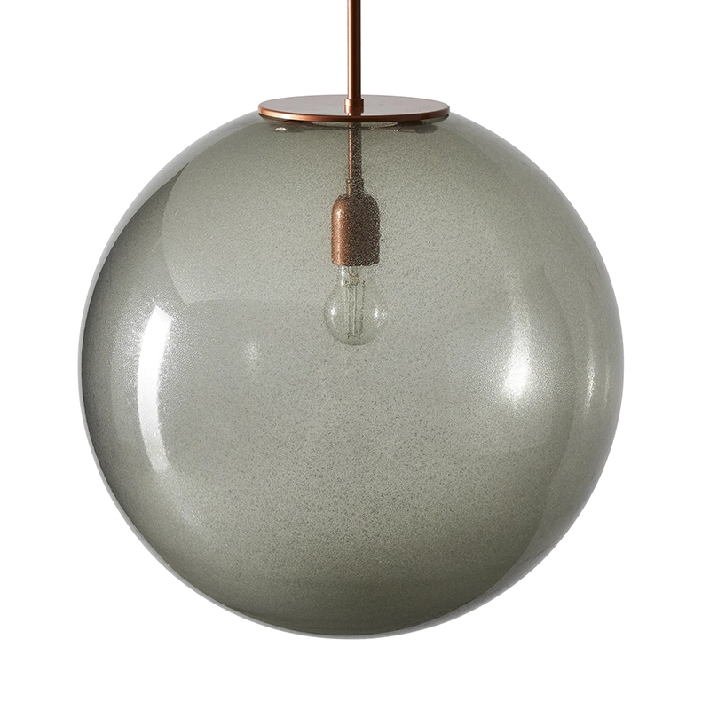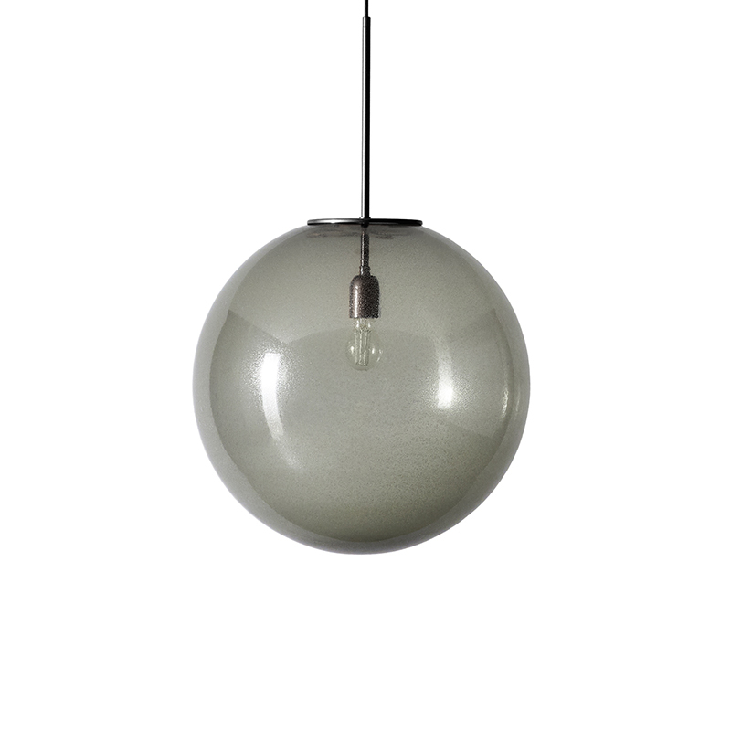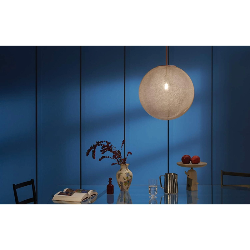 Cassina perpetuates the glassmaking tradition by offering the classic sphere in blown glass, which highlights the bubble surface characteristic of the artisan glassblowing technique. This aesthetic is reminiscent of the appearance of a fossil stone, where air bubbles give the glass a rough, matt appearance, transforming it from a transparent state into a textured material. The combination of transparency and roughness creates captivating plays of light, while the mattifying effect diffuses the light gently. The