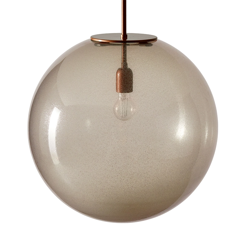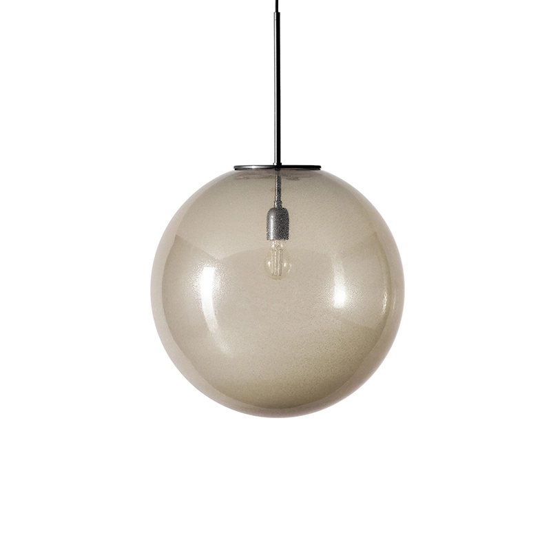 The suspension Bollicosasigned Cassina perpetuates the glassmaking tradition by offering the classic sphere in blown glass, which highlights the bubble surface characteristic of the artisan glassblowing technique. This aesthetic is reminiscent of the appearance of a fossil stone, where air bubbles give the glass a rough, matt appearance, transforming it from a transparent state into a textured material. The combination of transparency and roughness creates captivating plays of light, while the mattifying effect diffuses the light gently. The suspension Bollicosa by Cassina blends harmoniously into a variety of spaces, for example above a dining table.
