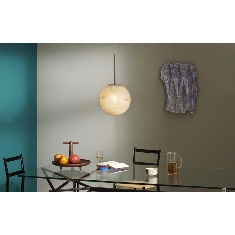 The suspension Bollicosa Small signed Cassina perpetuates the glassmaking tradition by offering the classic sphere in blown glass, which highlights the bubble surface characteristic of the artisan glassblowing technique. This aesthetic is reminiscent of the appearance of a fossil stone, where air bubbles give the glass a rough, matt appearance, transforming it from a transparent state into a textured material. Bollicosa Small suspended lamps are also available in marble or filigree glass in orange or blue. The suspension Bollicosa Small by Cassina fits harmoniously into a variety of spaces, for example in a kitchen or above a dining table.