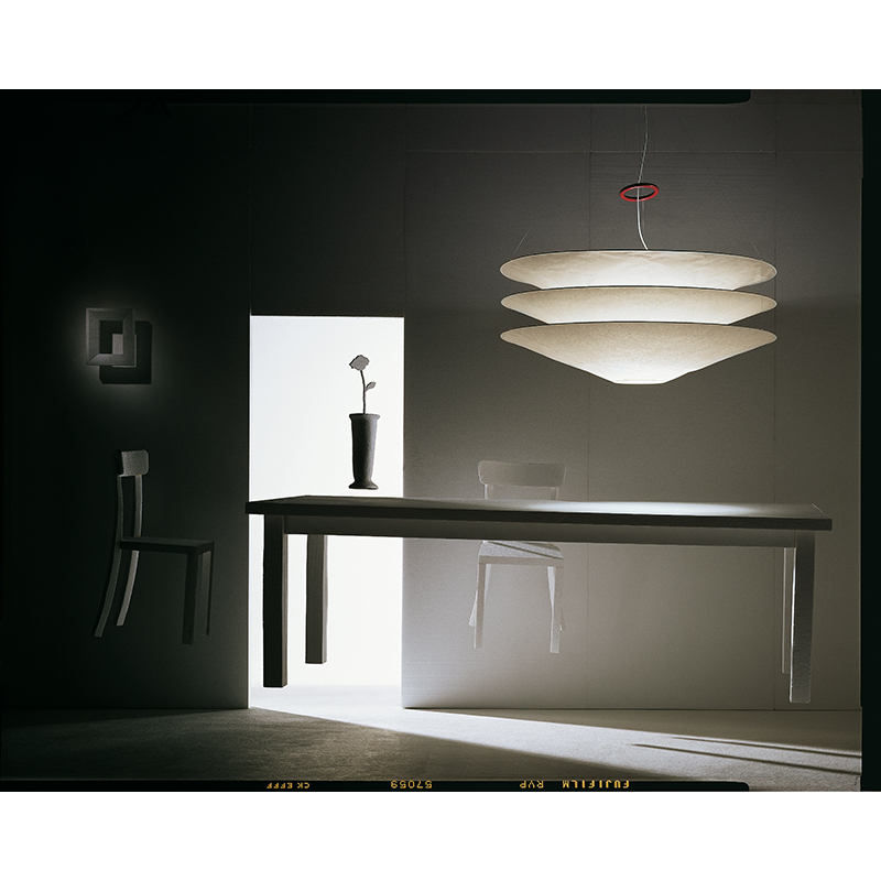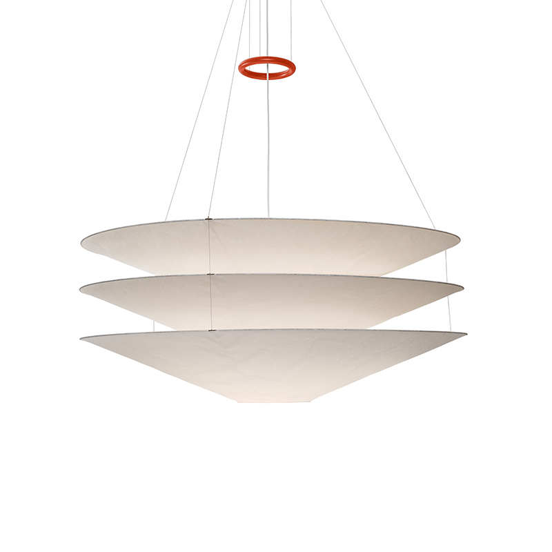 The Suspension Floatation by Ingo Maurer combines elegance and sobriety. It's made from Japanese paper and metal and has a red iron ring that adjusts the height of the suspension. Perfect for adding both light and a sculptural touch to any room, it is available in three sizes: 75 cm, 100 cm and 120 cm. The suspension Floatation d'Ingo Maurer is therefore perfect if you're looking for a soft yet effective source of light to illuminate your home.