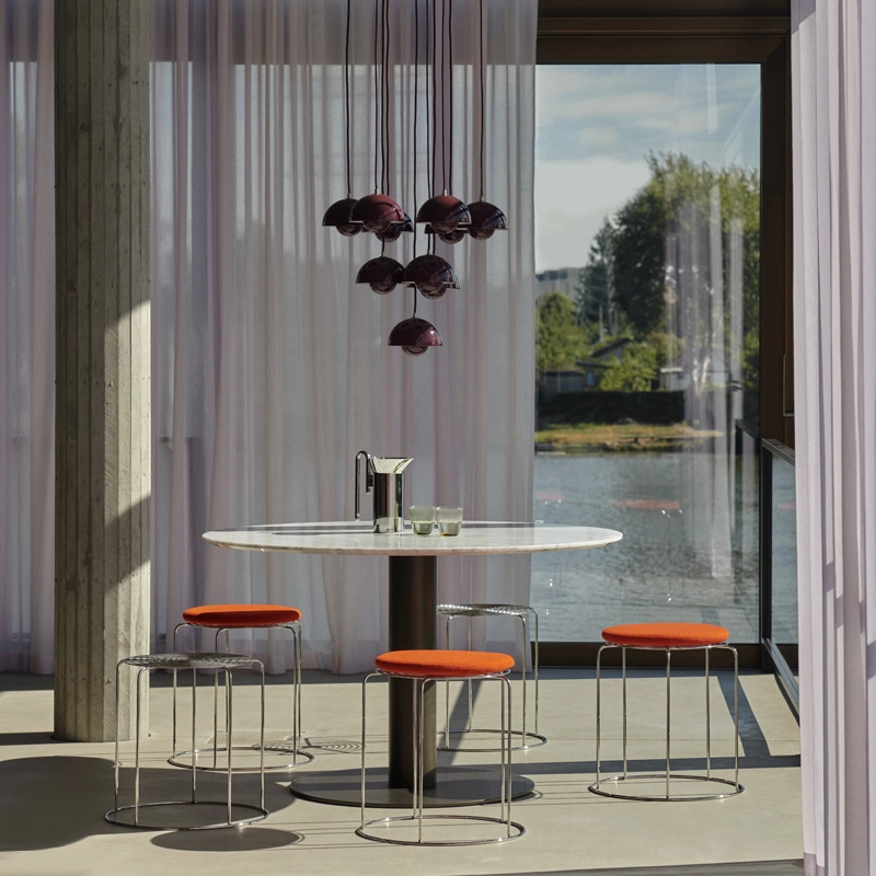 And Tradition presents Flowerpot Chandelier, in an exact translation of Verner Panton's characteristic immersive environments, as seen in his projects such as the interior of the Spiegel publishing house in 1969 and the space installation 'Pantorama' in 1979. It is now possible to create a chandelier using the iconic Flowerpot VP10 in 10-piece configurations.