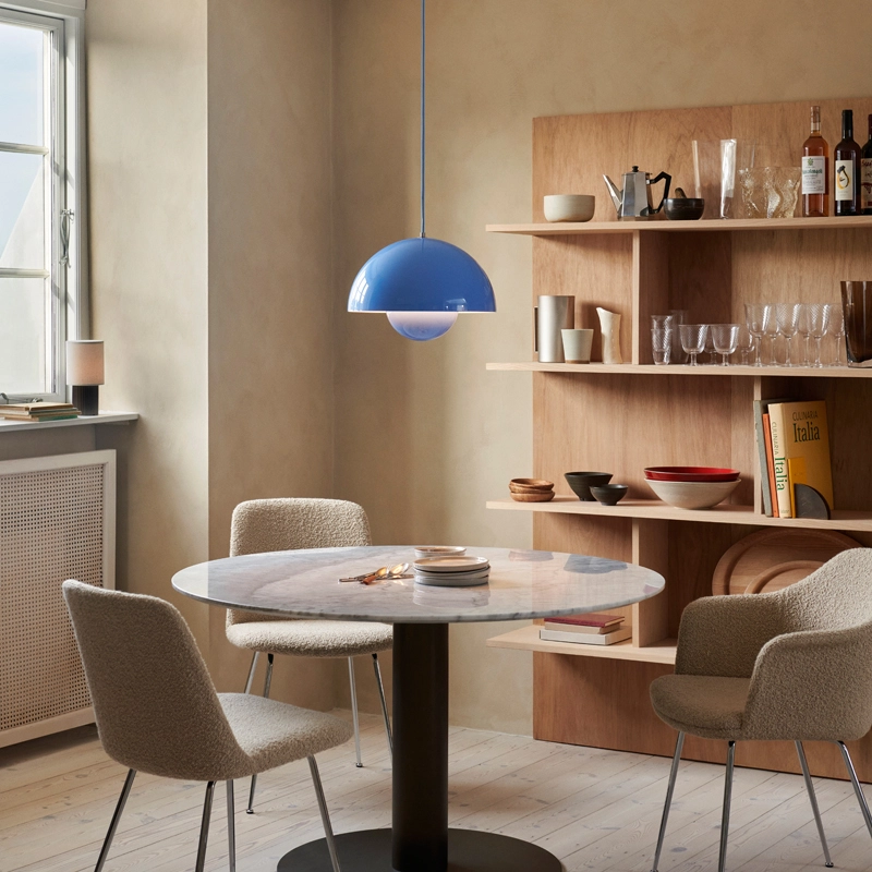 In 1968, the student riots in Paris, Rome and the United States overthrew the old, overly severe values and brought in the "Flower-Power" generation of peace, love and harmony. In the same year, Stanley Kubrick imagined the future, the year 2001, featuring in his film the Panton chair that had become a design classic and man was about to set foot on the moon. In the world of design, a colourful and fun pendant lamp was blooming in restaurants and exhibitions and was soon seen in homes, too. The FlowerPot lamp, with its two hemispheres facing each other, is a timeless and quality design, produced by &Tradition. With a wide range of colours, the FlowerPot collection is a welcome addition to the kitchen with the pendant model, or on a bedside table or in the living room, in its table lamp version.