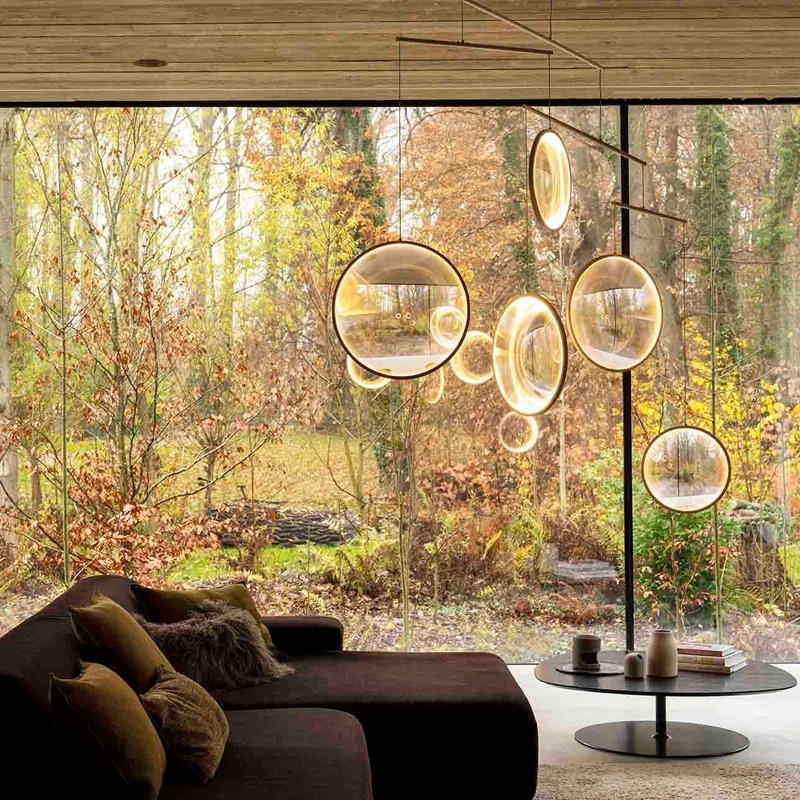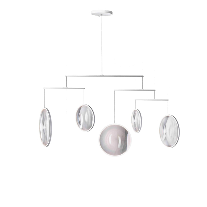 Available in three models, Focus by DCW is a suspension made up of luminous discs suspended like a mobile. It's an ethereal, poetic light that's as beautiful on as it is off. A veritable light sculpture that inhabits the space and transforms it. The different sized lenses of Focus are like magnifying glasses and change the perception of the environment depending on where the luminaire is viewed from.