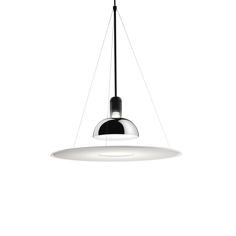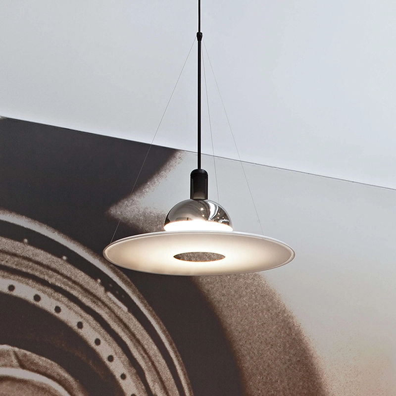 Designed in 1978 by Achille Castiglioni, the suspension Frisbi is a design staple, a futuristic piece with an ethereal presence. Published by Flos, this luminaire emits direct, diffused and reflected light. It features a flat diffuser in injection-moulded opaline polymethylmethacrylate (PMMA), suspended from the body of the luminaire by three harmonic steel wires. The reflector is made from moulded sheet metal, polished, nickel-plated, coated with a protective lacquer and fully lacquered in white. Frisbi is a timeless suspension lamp that will find its place in any style of interior.