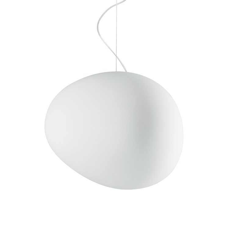 Foscarini. Inspirée de la nature et issue d'une recherche approfondie, la forme du diffuseur fait penser à un grand galet poli par l'eau, ou bien à l'œuf d'un animal mythologique, symbole de la création et de la régénération. C'est un volume à la fois familier et surprenant, car la forme asymétrique de