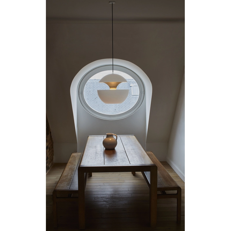 Bertrand Balas, a Toulouse architect born in 1935, loves to contemplate sunsets over the Garonne. As he likes to say with a certain musicality: "It makes me feel good." In August 1970, he created the luminaire Here Comes the Sun. Inspired by the setting sun, this aluminium suspension can be arranged singly or in clusters, and is available in a range of formats and colours. Edited by DCW éditions, the original suspension Here Come the sun 450 looks at first glance like all the lamps said to be, well, original. But when it's lit, the Here Comes the Sun suspension becomes magical. With Here Comes the Sun, the night becomes soft and reassuring.