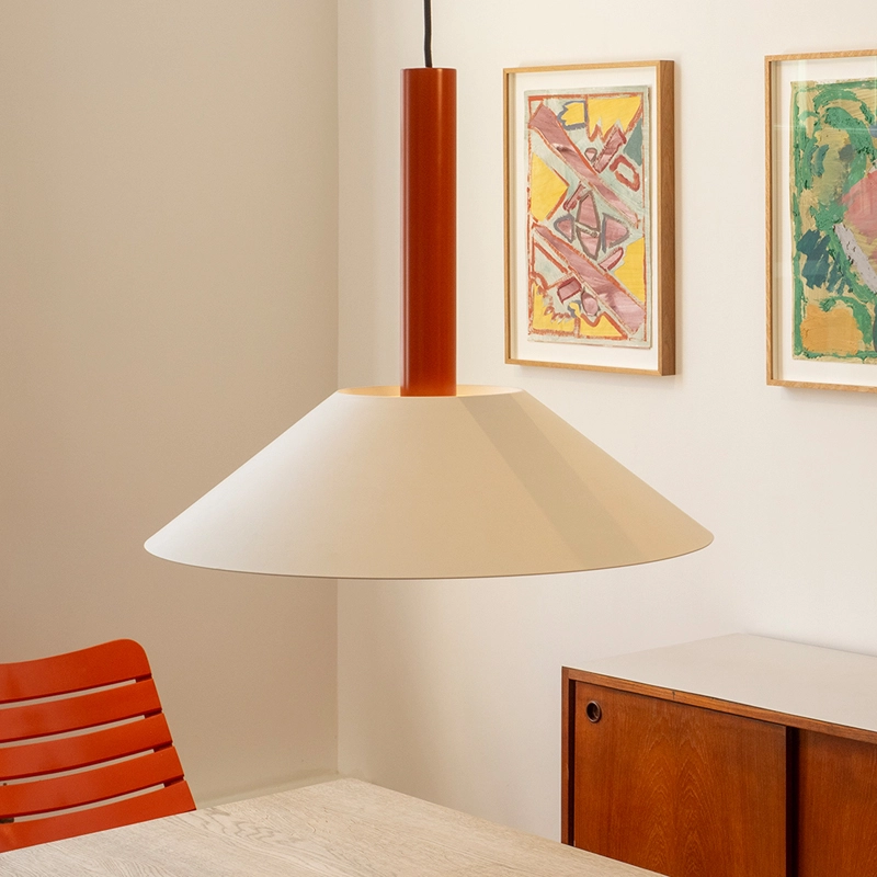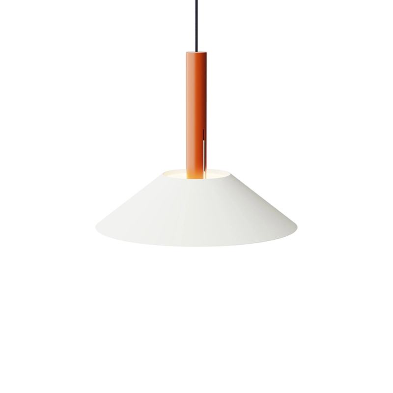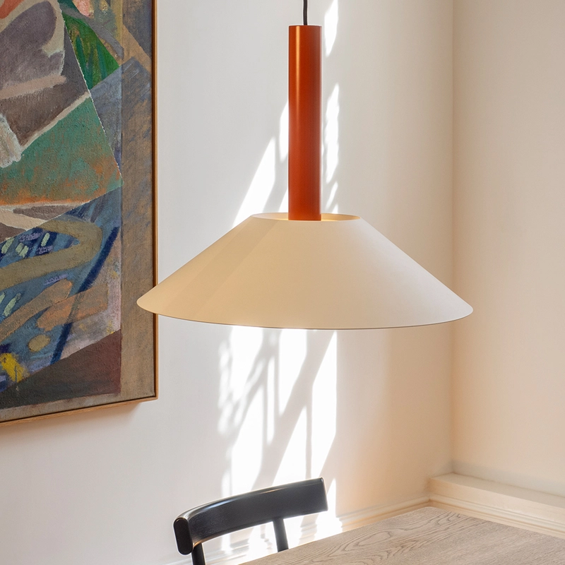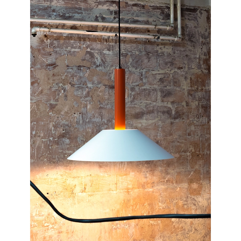 Hook is a collection of pendant lights, based on two simple geometric shapes: a large cone for the lampshade and a cylinder for the luminaire. The shade hangs from a single stainless steel hook, giving it the impression of floating. The Hook suspension is available in two sizes and four colours, each with its own distinctive character. Edited by Nine, Hook is perfect above a dining table or in the centre of a living room.