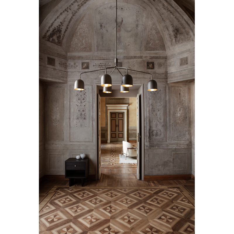 With the Howard collection, the designers at Space Copenhagen wanted to pay homage to New York City, to its industrial aesthetic dominated by dark metals. Originally designed for the Howard Hotel in Manhattan's SoHo district, the Howard lighting series was inspired by the materiality and colours of the hotel's neighbourhood. With subtle references to New York's industrial atmosphere, the Howard luminaires incorporate refined and elegant details. It's a complete range of luminaires with a coherent design and unified aesthetic that can be deployed in interiors, restaurants and hotels. The different luminaires work both on their own and in combinations of several models. The Howard chandelier is the result of a close collaboration between Space Copenhagen and Gubi, who have used cutting-edge technologies, to ensure optimal design. Available with four or six arms, the Howard chandelier has a strong, sophisticated and modern expression. It is equally at home in a dining room, restaurant or hotel lobby. Howard is available with a Gunmetal finish on the outside and brushed brass on the inside, bringing warmth to the downward diffused light. The porcelain version, meanwhile, creates a more diffused light, for a softer ambience.