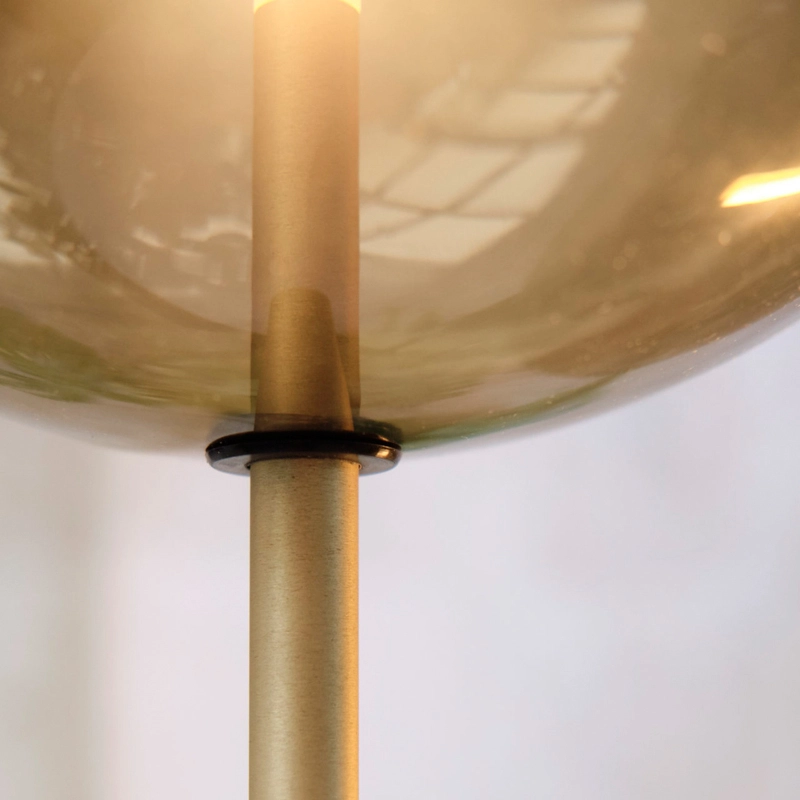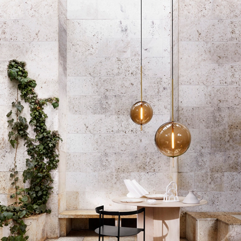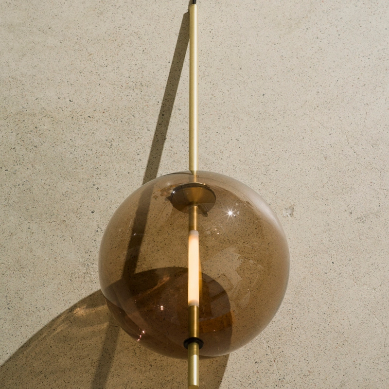 The customised light source is shaped and fitted transparently into the glass sphere. Emitting its glow from the centre of the sphere, the lamp can be fitted with a dimmer to create the desired ambience in the space.