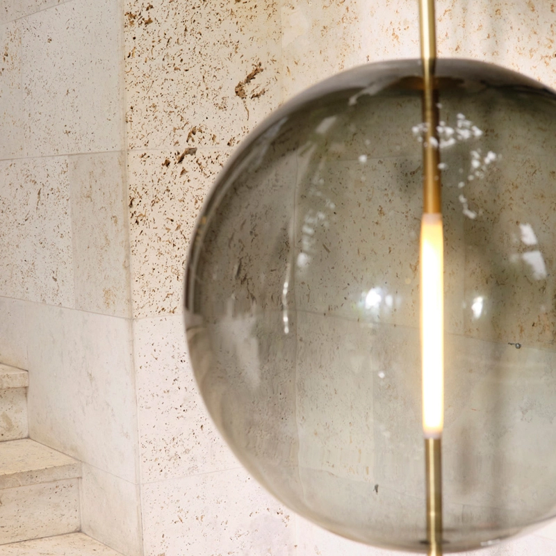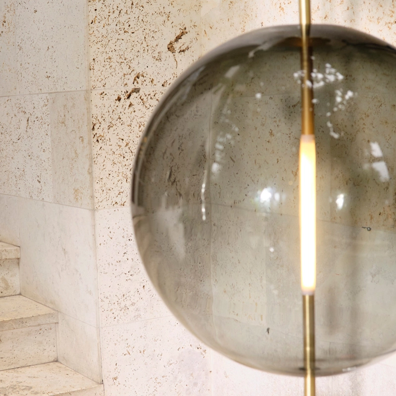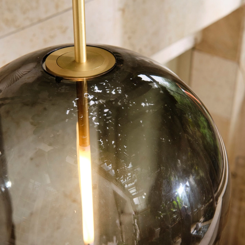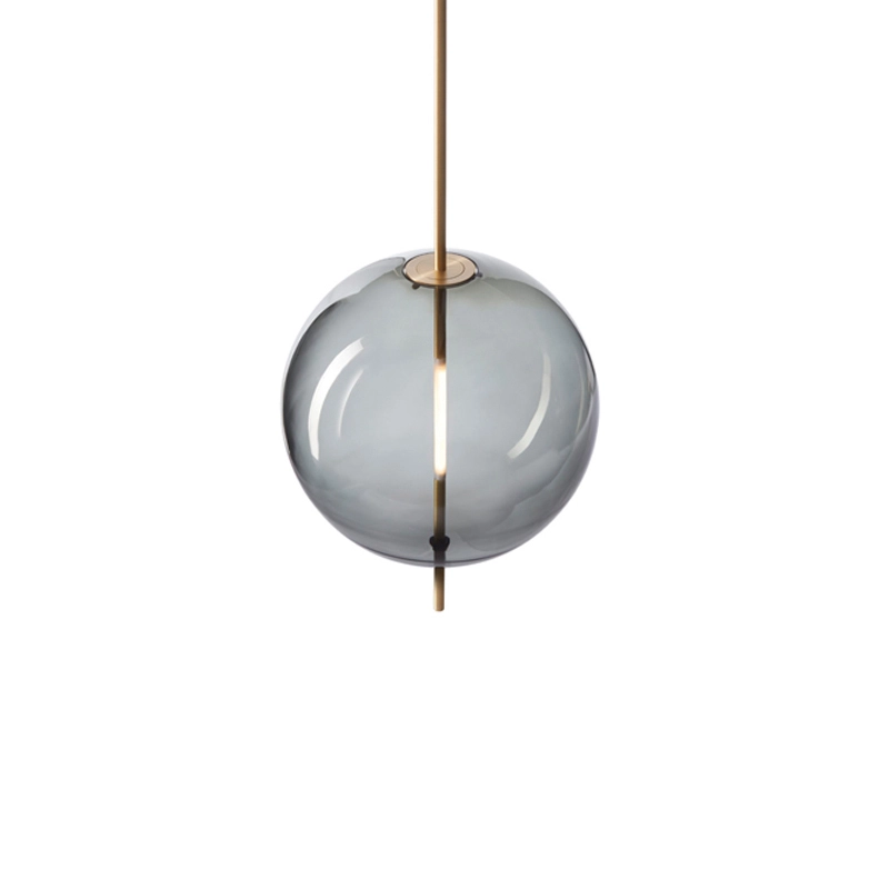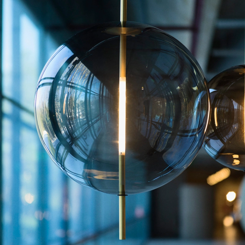 The customised light source is shaped and fitted transparently into the glass sphere. Emitting its glow from the centre of the sphere, the lamp can be fitted with a dimmer to create the desired ambience in the space.