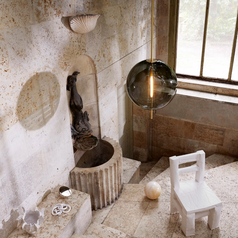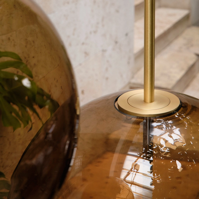 The customised light source is shaped and fitted transparently into the glass sphere. Emitting its glow from the centre of the sphere, the lamp can be fitted with a dimmer to create the desired ambience in the space.