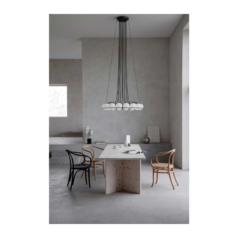 Throughout his life, Gino Safatti drew his inspiration from the sky, fascinated in particular by the perfect light of the Moon. In 1959, he launched the "Le Sfere" collection, a graphic and poetic lighting system based on the sphere.  The suspension 2109 features a circle of opal blown glass spheres on a black or champagne steel structure. The spheres can be oriented upwards or downwards to provide direct or indirect light. A chandelier that lends itself to a wide range of applications, from domestic environments to public spaces.