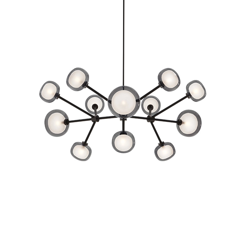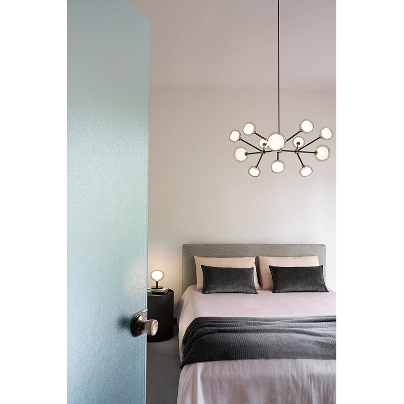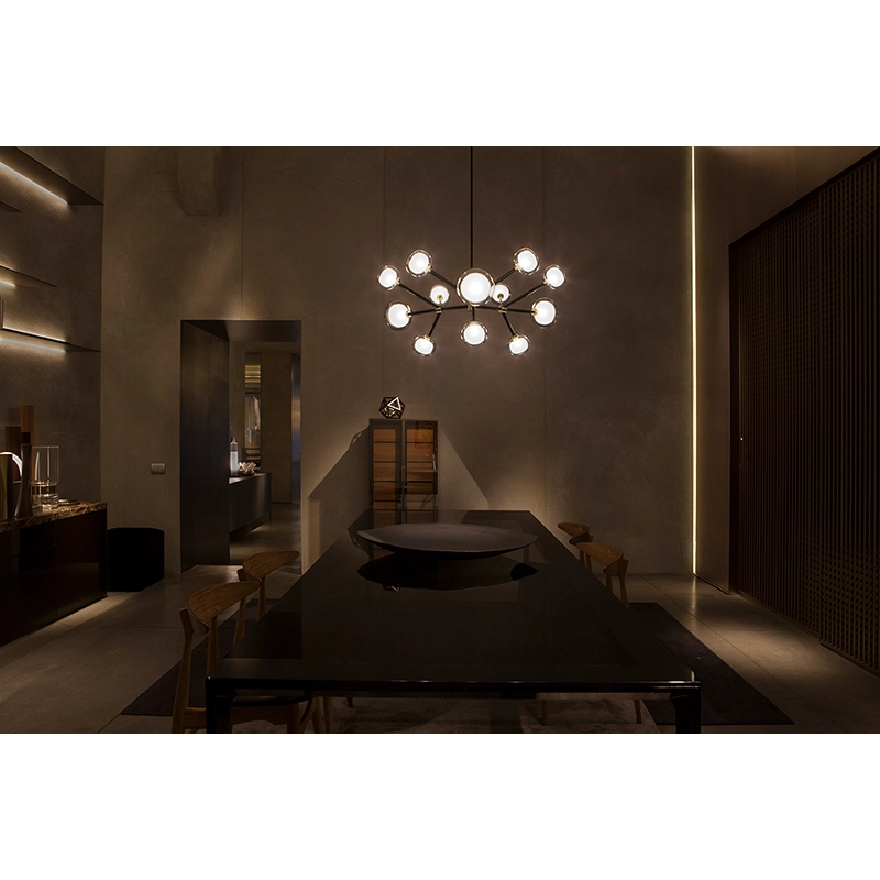 Inspired by the design of 50s lighting, the luminaires in the Nabila collection from Tooy embody elegance and sophistication, bringing a touch of refinement to any space. The suspension Nabila 552.12 stands out for its double-walled borosilicate glass light globes, available in a variety of configurations, and its epoxy powder-coated metal structure, embellished with brushed brass details. Combining luxury with sobriety, the suspension Nabila 552.12 embodies true elegance in a single element. With Nabila, Tooy offers a wide range of lighting fixtures from sumptuous chandeliers available in different sizes to smaller versions designed for nightstands, floor lamps and wall sconces.