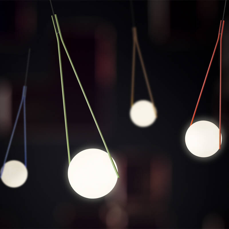 The NomNom suspension lamp by Odin Visser edited by MOOOI, is a thoroughly modern lighting design. This modestly sized luminaire perfectly encapsulates the art of omission, a minimalism that reinforces its unique character. The opaque, spherical diffuser of NameName is held in balance between two thin, almost invisible metal rods, giving the airy sensation that the light source is suspended in a vacuum. As a stand-alone luminaire, there's no getting around the playful elegance of the NomNom suspension, but its effect is multiplied when accompanied by other lamps, in a bouquet or lined up.