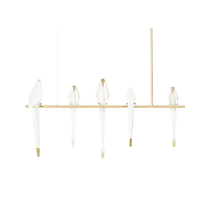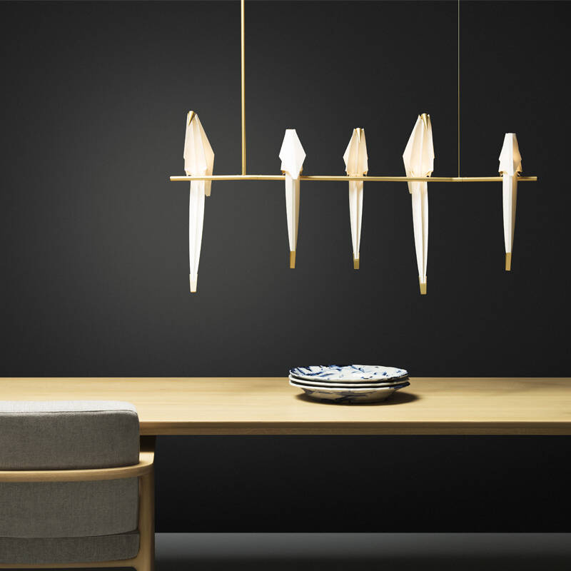 All the subtlety of Perch is included in the balance of a fine gilded metal structure, which links the base or canopy of the lamp to the diffusers, hidden in the silhouette of the birds.