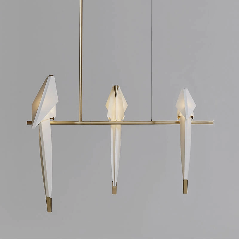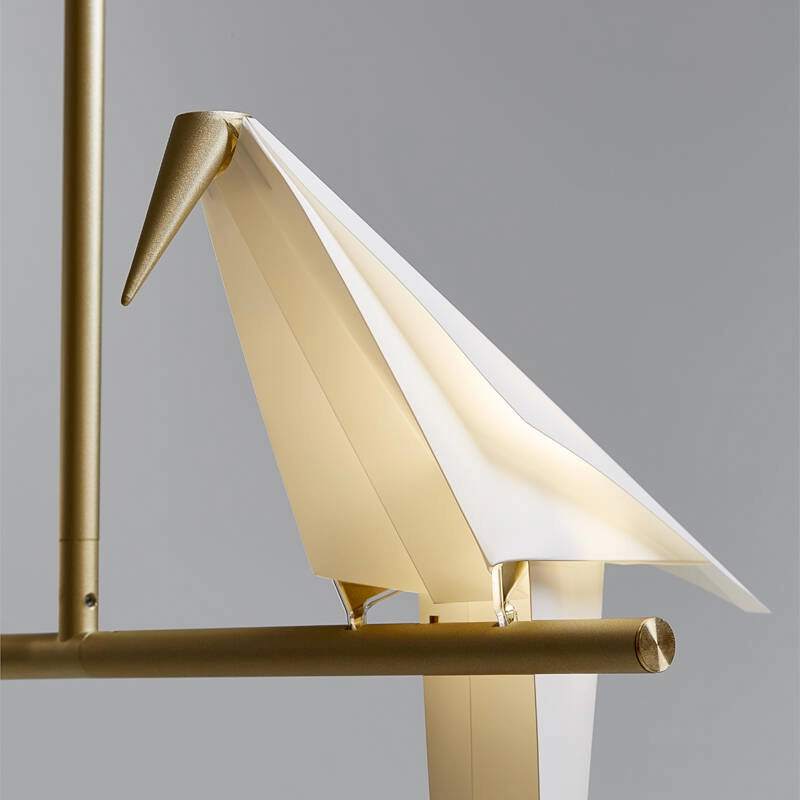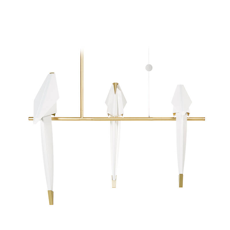 All the subtlety of Perch is included in the balance of a fine gilded metal structure, which links the base or canopy of the lamp to the diffusers, hidden in the silhouette of the birds.