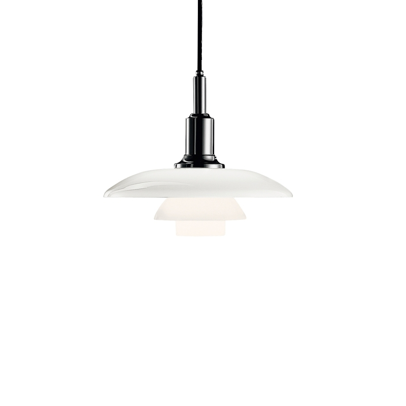 The PH 3/2 suspension lamp, designed by Poul Henningsen for Louis Poulsen, is conceived on the principle of a set of reflective shades, directing most of the light downwards. The shades are made from three layers of blown opal glass, polished on the outside and sandblasted on the inside, giving off a soft, diffused light. Timeless, the PH 3/2 Louis Poulsen suspension lamp fits in with all interior styles. The PH 3/2 suspension is available in three colours: High-gloss chrome, metallic black, metallic brass.
