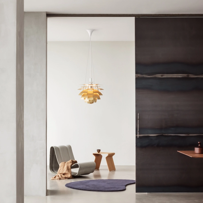 Designed by Poul Henningsen over 40 years ago, the PH Artichoke suspension is now considered a design classic. The structure is made with twelve steel arches. On this structure, Poul Henningsen placed 72 copper sheets, with six blades in each row. Since each level is staggered in relation to the previous one, the 72 leaves can cover each other. This design allows a good view of the lamp from any angle without directly seeing the light source located in the centre of the pendant. The PH Artichoke were originally developed for a Copenhagen restaurant called the Langelinie Pavilion, where they can still be admired today.