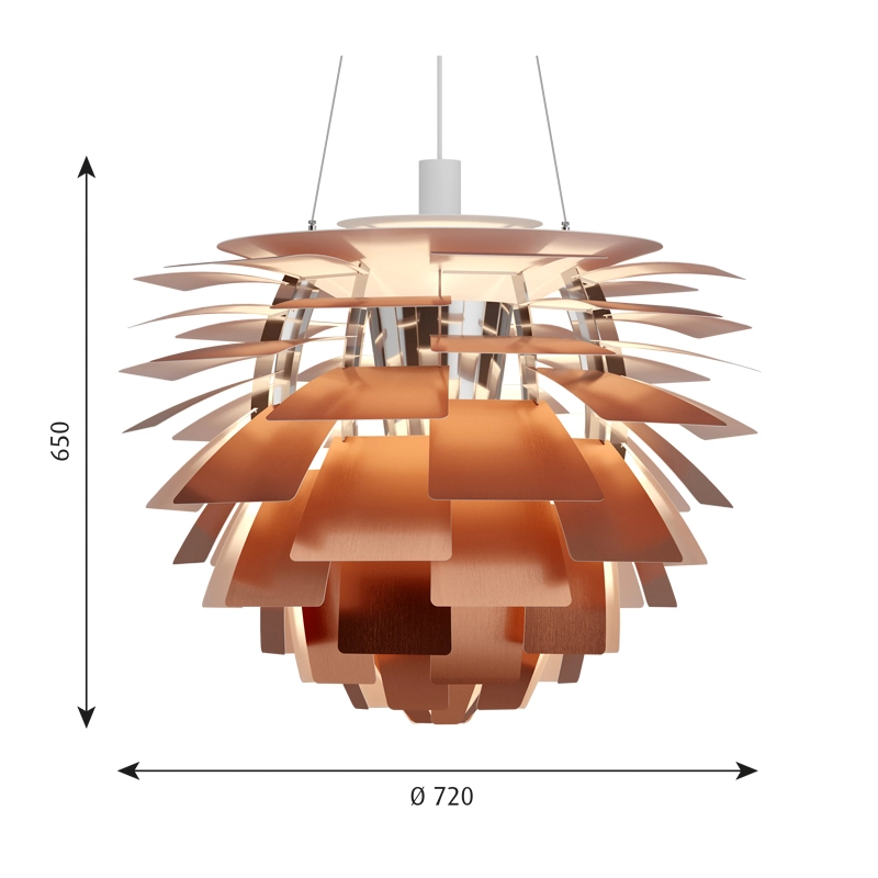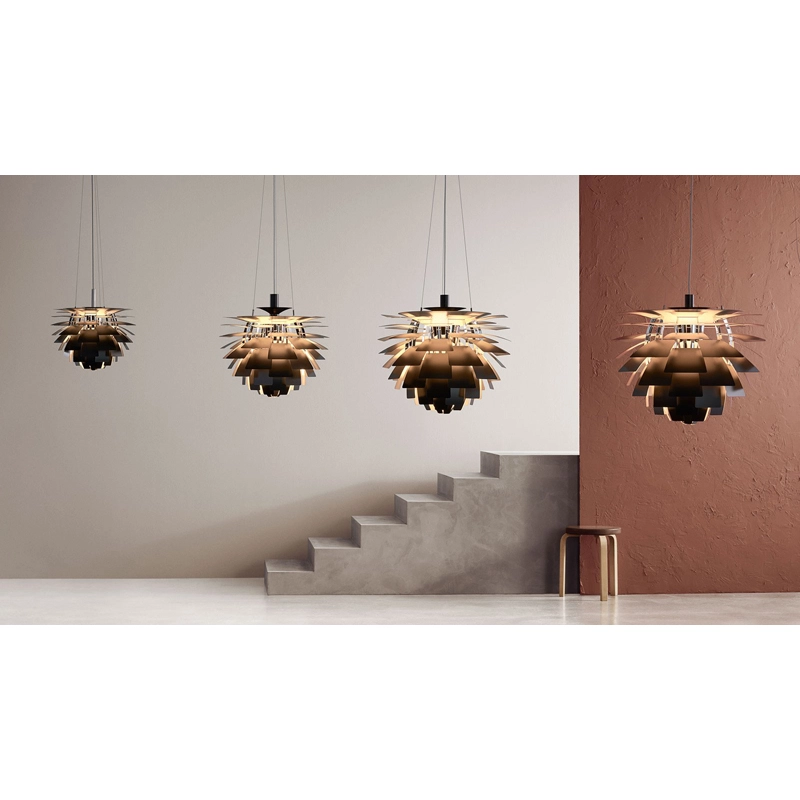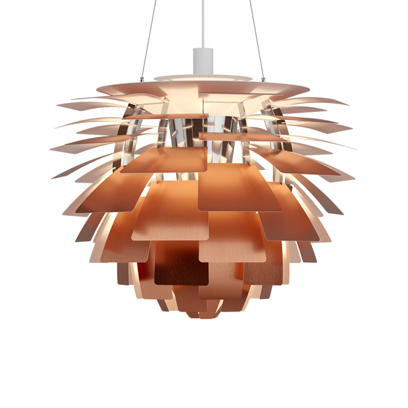 When Poul Henningsen designed the iconic PH Artichoke for Copenhagen's Langelinie Pavillonen restaurant in 1958, he opted for copper slats with a pink finish on the inside. With this combination, the PH Artichoke is exceptionally warm and reflects the light from its masked light source superbly. The PH Artichoke produces soft, glare-free lighting. Its complex design and structure ensure that the light is evenly distributed throughout the room. Edited by Louis Poulsen, the PH Artichoke suspension is now considered a design classic.