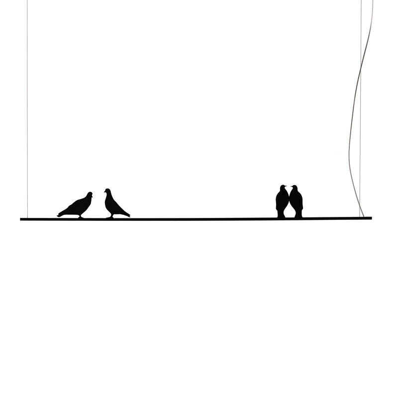 Phil is a black metal suspension, imagined as a thread stretched through space and crossed by stories. This light, graphic lamp oscillates between fantasy and reality. Backlit silhouettes stand out in the space and tell stories of impossible undertakings or everyday life. The silhouettes can be positioned anywhere along the length of the suspension. Available with different silhouette kits, the