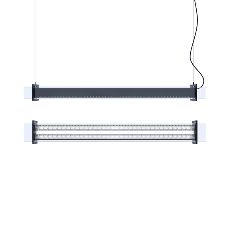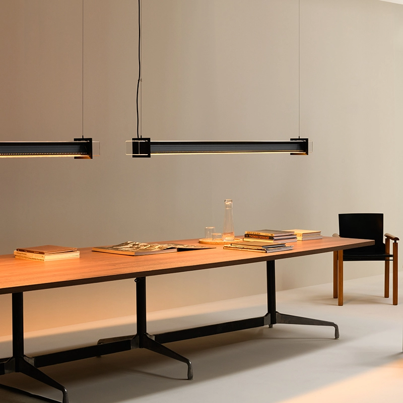 With its tapering rectangular silhouette supported by two wires and its discreet integration of the power cable, the Sammode Quadratube P2 power supply illustrates the meeting of aesthetics and function. This suspension lamp by Jean-Michel Wilmotte provides a soft, comfortable light for both residential and professional spaces, thanks to its integrated LED module, reflector and anti-glare louvre. The perforations in its scrolling grid create lateral points of light that diffuse the light in a subtle and captivating way. The Quadratube Sammode collection includes different models of wall and ceiling lights to suit any space.