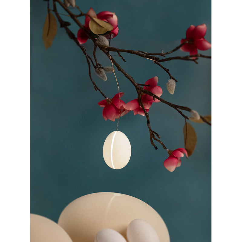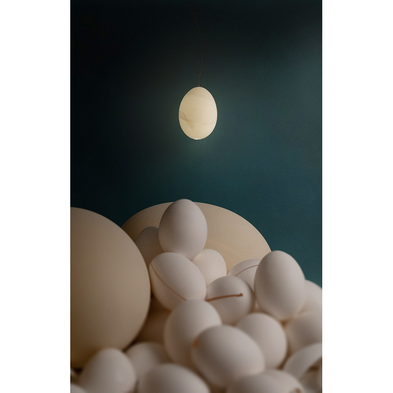 Made from a real eggshell, Reality is a delicate, fragile and effective lamp designed by Theo Möller for Ingo Maurer. The suspension Reality is made from a real certified organic egg, into which a fine geometric slit is painstakingly cut. Suspended by copper cables, the LED provides soft lighting with just nine lumens. It is in this discretion that the true beauty of the Ingo Maurer Reality lamp lies. Reality comes in a secure cardboard box with three copper needles and a suspension cable with USB connection.