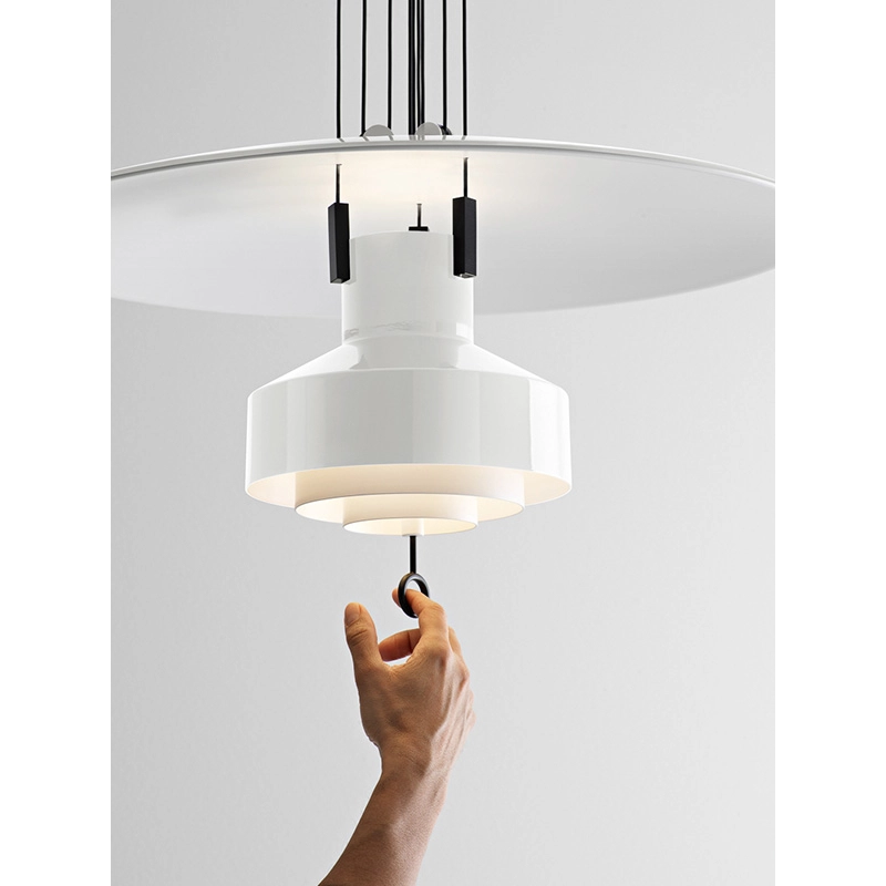 Designed in 1957 and produced the following year in two unique examples for the Milan Chamber of Commerce, the suspension Saliscendi is now being reissued with LED sources. This adjustable metal suspension with double emission was designed by the brothers Achille and Pier Giacomo Castiglioni. Produced by Stilnovo , the suspension Saliscendi illustrates the modernity of Italian design in the 1950s. Salicendi has an original structure: the height of its luminous body and reflective disc are adjustable thanks to a system of pulleys, ensuring perfectly adjustable lighting. The two elements, which move in opposite directions, emit direct or indirect light depending on the distance between them.