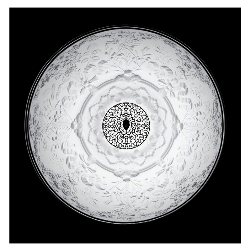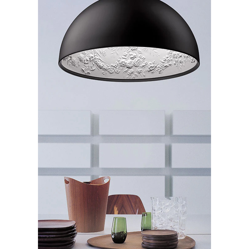 Designed by Marcel Wanders, Sky Garden is an eye-catching and poetic pendant light produced by Flos. Light is diffused under a plaster cast dome, which is finished in white on the inside and bronze on the outside. The frosted glass diffuser provides soft light and illuminates the plant motifs inside the dome. With Sky Garden, Marcel Wanders has created a beautiful connection between the decorative baroque-style carvings and the extremely contemporary, streamlined exterior. He makes you want to look up towards the dome to admire the celestial garden suspended in your living room.