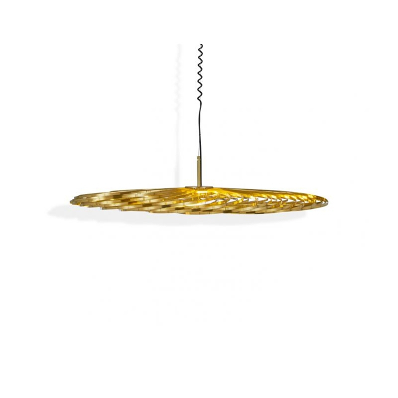Available in silver or brass, Spring by Tom Dixon can be used on its own or as a composition of several lights for a theatrical effect. When switched off, La suspension Spring is like an aerial sculpture, and when switched on, it creates graphic and different plays of light depending on the chosen configuration.