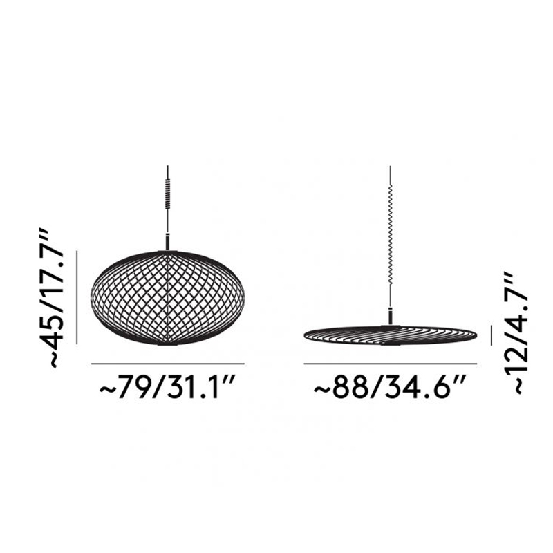 Designed by Tom Dixon, Spring is a series of three suspensions made from high-performance stainless steel blades. Each flexible stainless steel ribbon is arranged like a whip around the dimmable, bespoke Tom Dixon LED disc. The semi-transparent shape created in this way can be adjusted into different silhouettes: in its flat form, Spring is reminiscent of a spirograph design, in another configuration it looks like a flying saucer, and its largest form is similar to a pumpkin.