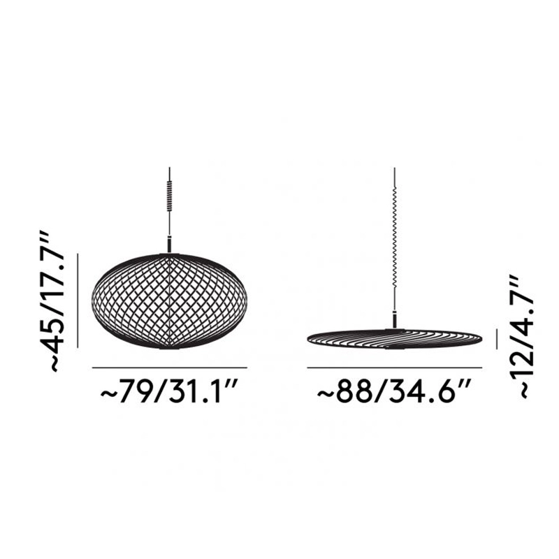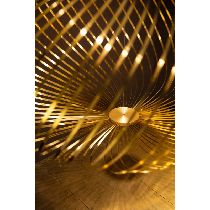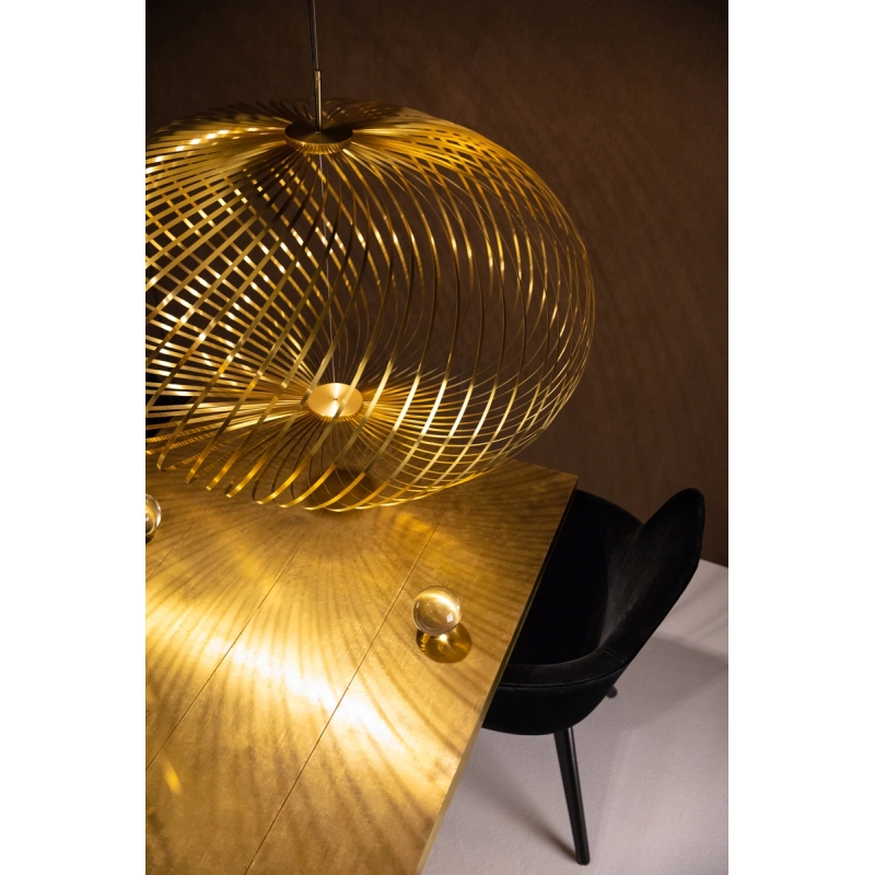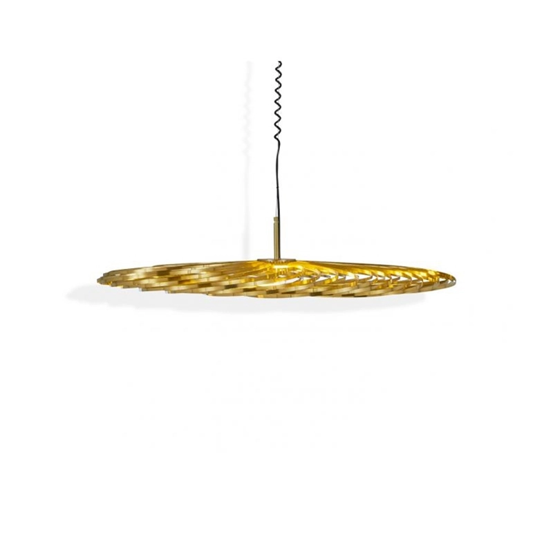 Designed by Tom Dixon, Spring is a series of three suspensions made from high-performance stainless steel blades. Each flexible stainless steel ribbon is arranged like a whip around the dimmable, bespoke Tom Dixon LED disc. The semi-transparent shape created in this way can be adjusted into different silhouettes: in its flat form, Spring is reminiscent of a spirograph design, in another configuration it looks like a flying saucer, and its largest form is similar to a pumpkin. Available in silver or brass, Spring by Tom Dixon can be used on its own or as a composition of several lights for a theatrical effect. When switched off, La suspension Spring is like an aerial sculpture, and when switched on, it creates graphic and different plays of light depending on the chosen configuration.