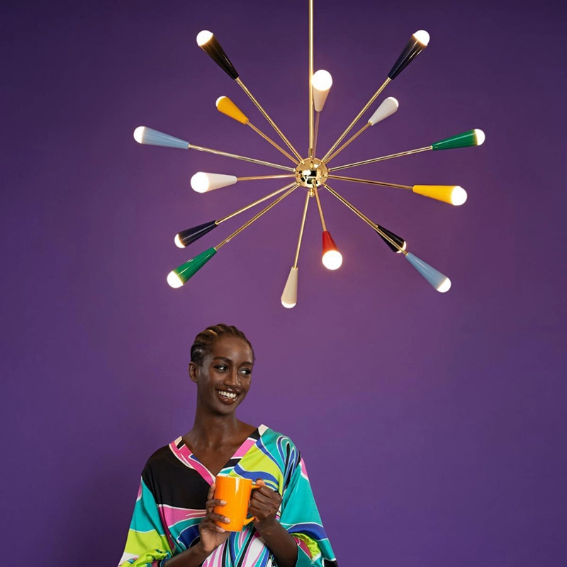 Sculptural, the suspension Sputnik extends in all directions in an explosion of light, a firework display that will illuminate your living rooms perfectly! The structure of this suspension signed Stilnovo in 1957 has sixteen precious brass arms with galvanic gilding combined with end caps available in black, ivory or in the vibrant and cheerful multicoloured variant. With its generous dimensions and strong personality, the suspension Sputnik is ideal for large living areas where it will stand out perfectly.
