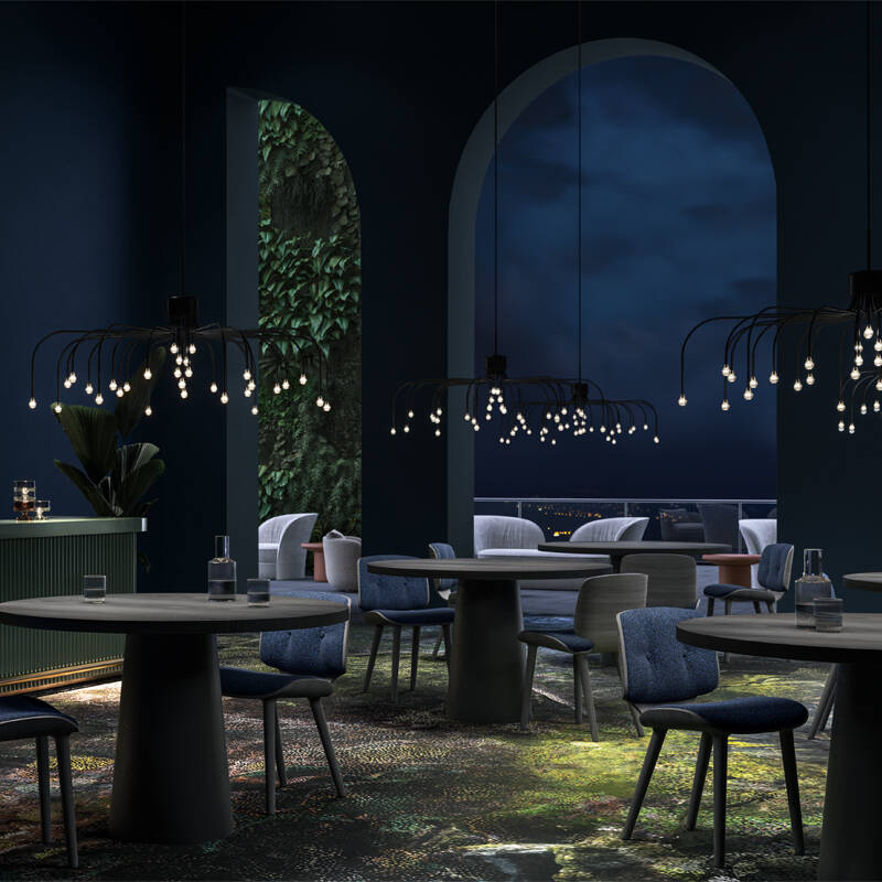 The Starfall suspension is perfectly suited to decorating reception rooms, to which it brings all the magic of a night sky, with refinement and fascination.