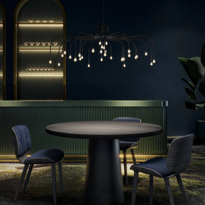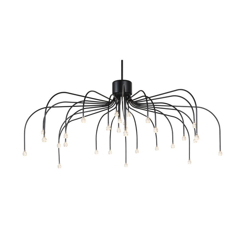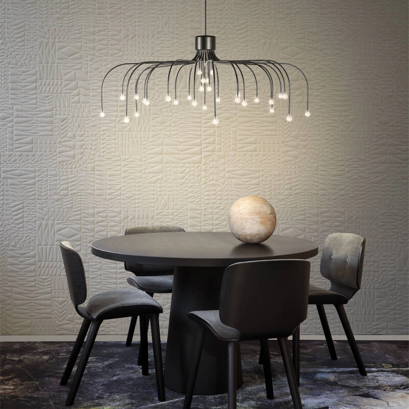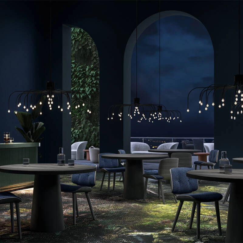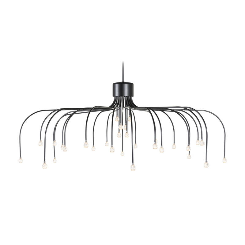 The Starfall suspension imagined and created by Front for MOOOI, presents itself as a whole new way of experiencing light. This luminaire is a truly contemporary take on the classic pendant. The circular structure of Starfall is punctuated by light sources forming a sumptuous bouquet of stars frozen in time. The size of the slender branches that link all the bulbs varies so as to multiply the points of view, revealing an infinite number of luminous constellations. The Starfall suspension is perfectly suited to decorating reception rooms, to which it brings all the magic of a night sky, with refinement and fascination.