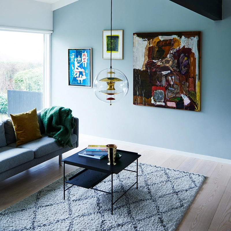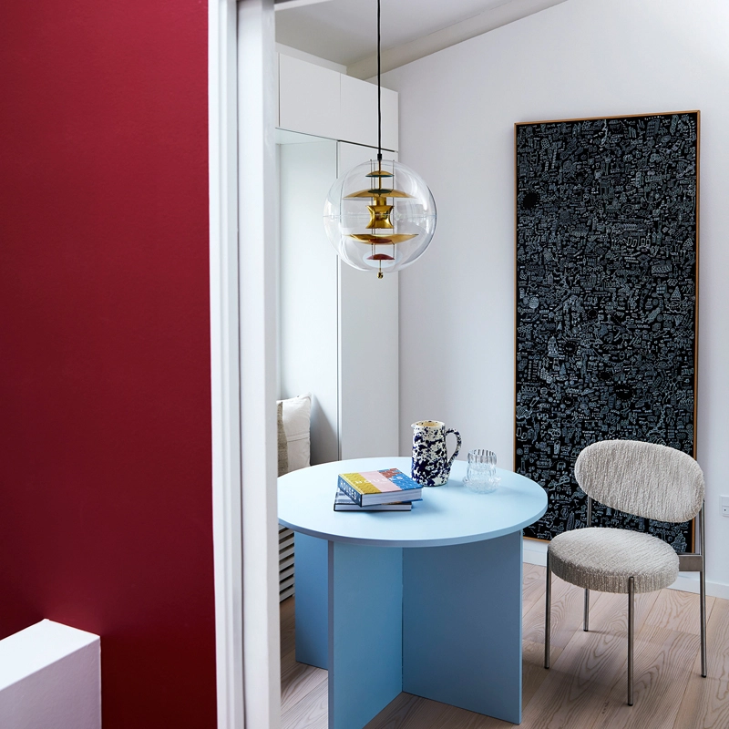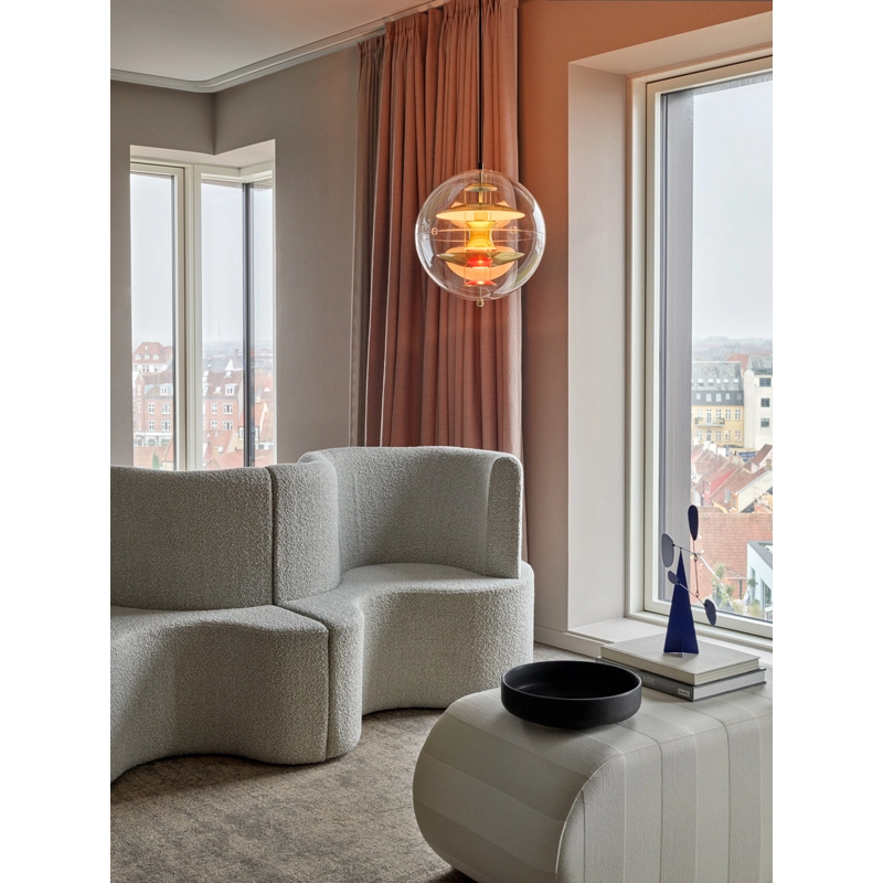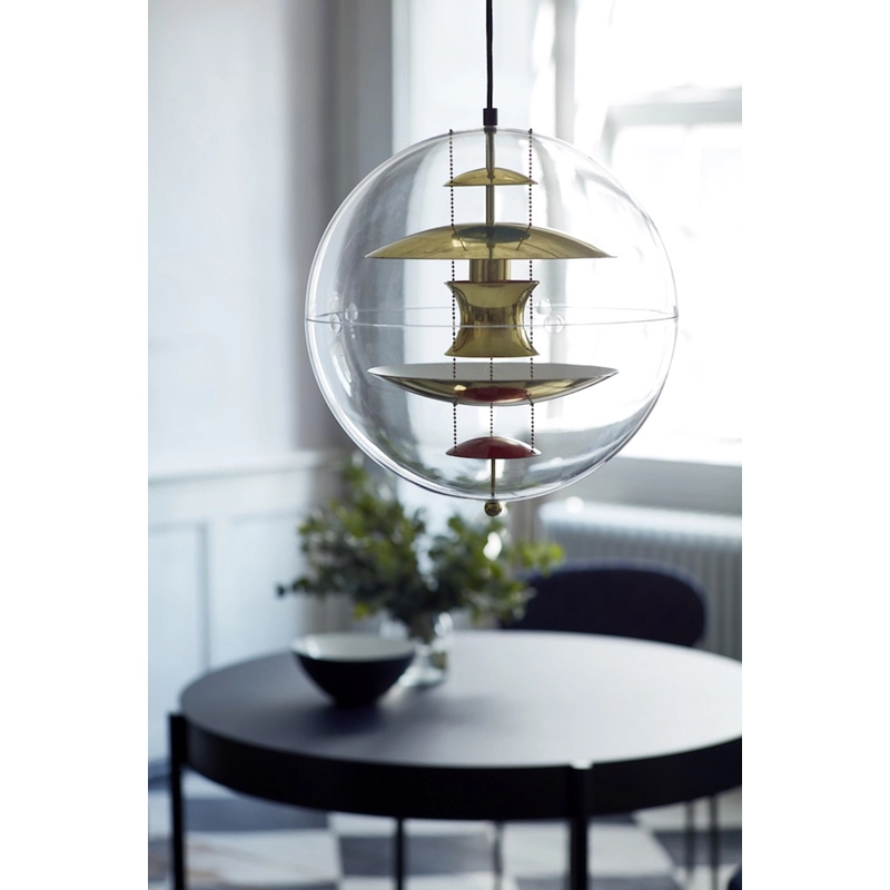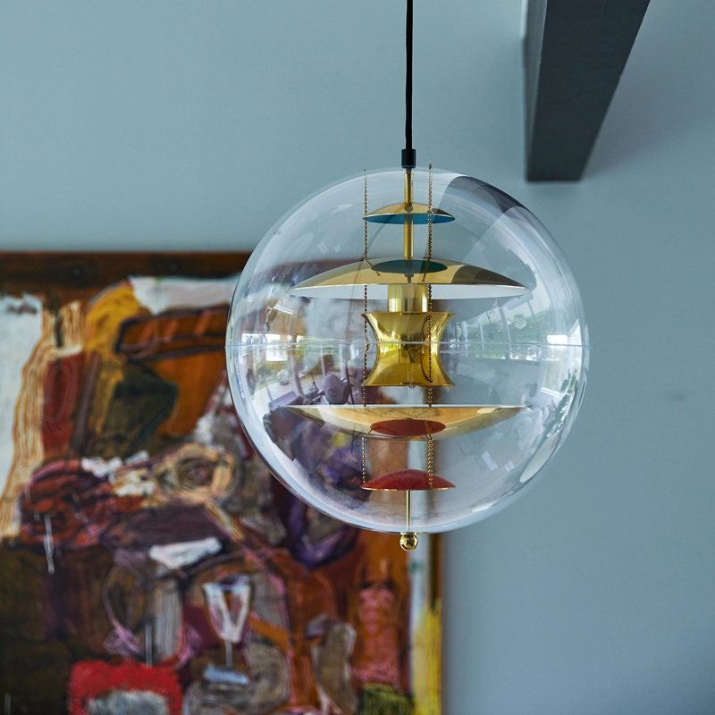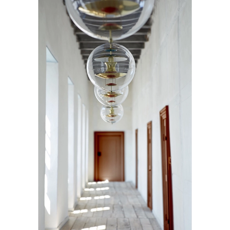 The VP Globe design suspension comprises an outer sphere in crystal-clear acrylic with five inner reflectors suspended by three steel chains. Touches of red and blue add the finishing touch to the futuristic sculptural design and underline the unmistakable Panton design DNA. With the VP Globe, Panton's ambition was to design a lamp that could catch the eye and unite a room, whether hung alone or in clusters. This makes it an ideal choice above a dining room table, in an entrance hall or long corridor, or as a sculptural element in a corner.
