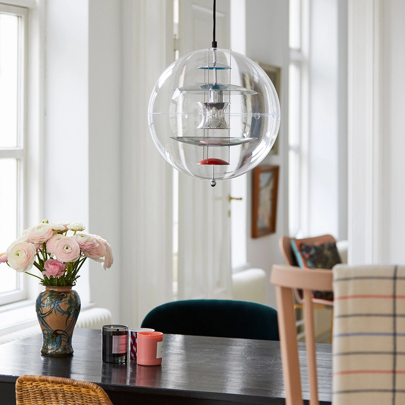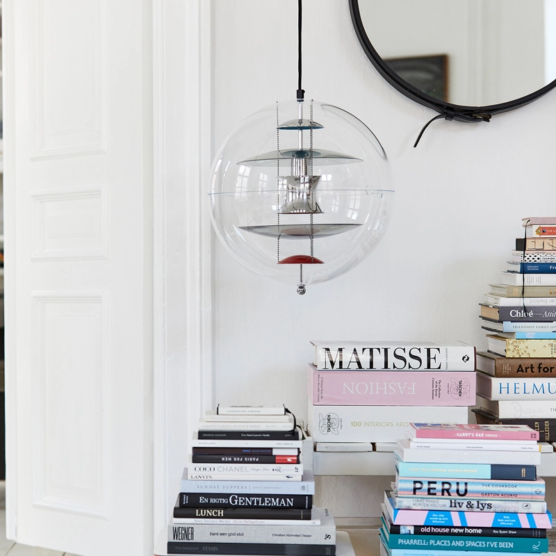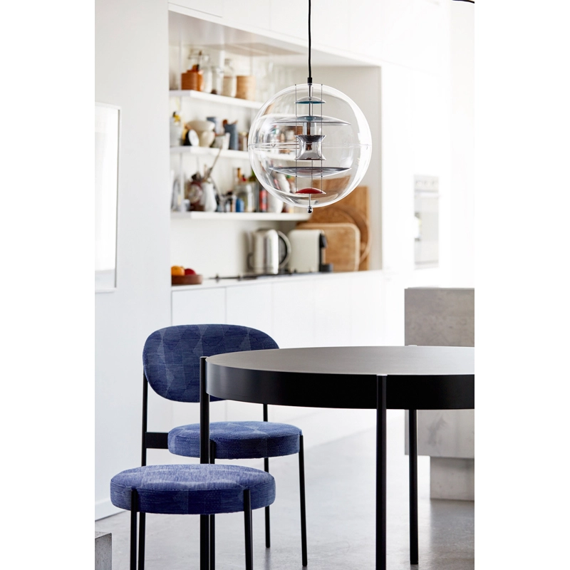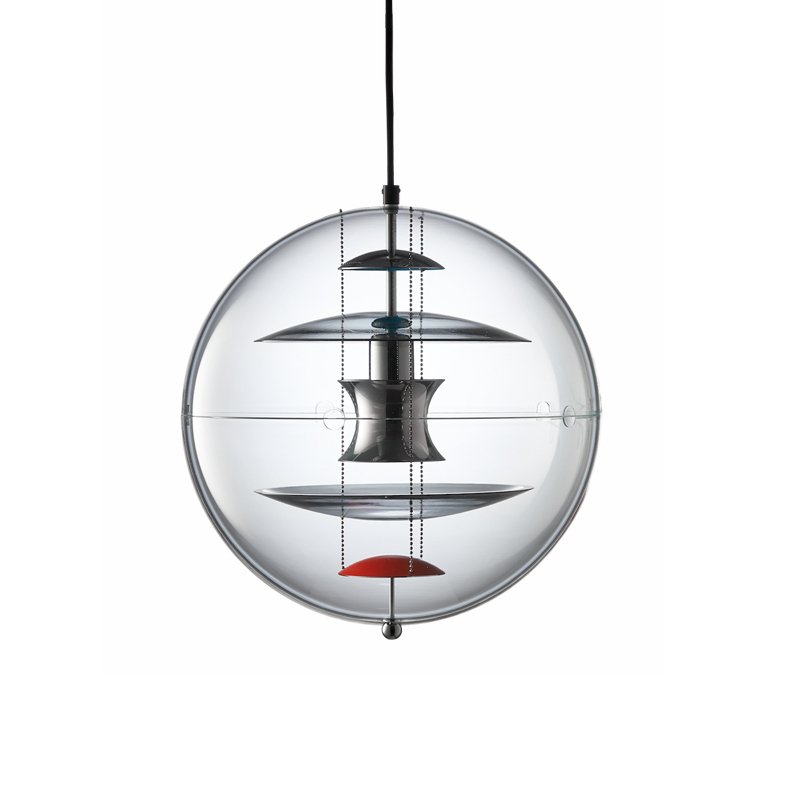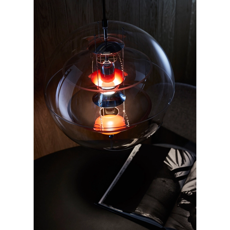 The VP Globe design suspension comprises an outer sphere in crystal-clear acrylic with five inner reflectors suspended by three steel chains. Touches of orange and blue add the finishing touch to the futuristic sculptural design and underline the unmistakable Panton design DNA. With the VP Globe, Panton's ambition was to design a lamp that could catch the eye and unite a room, whether hung alone or in clusters. This makes it an ideal choice above a dining room table, in an entrance hall or long corridor, or as a sculptural element in a corner.