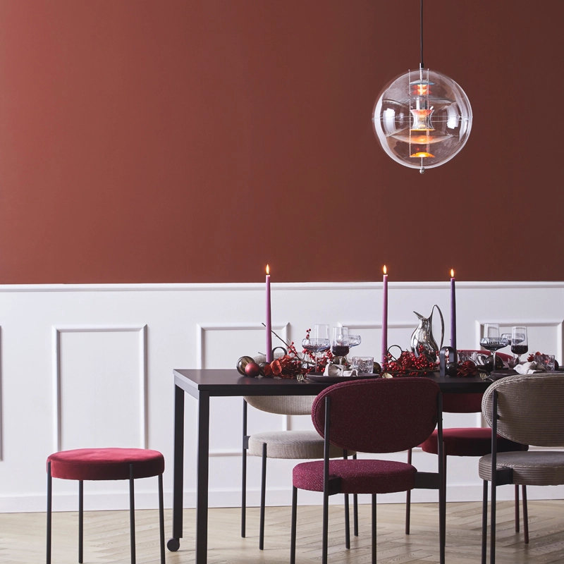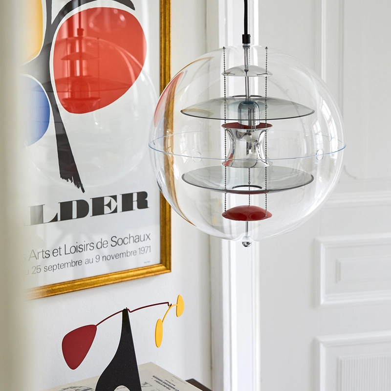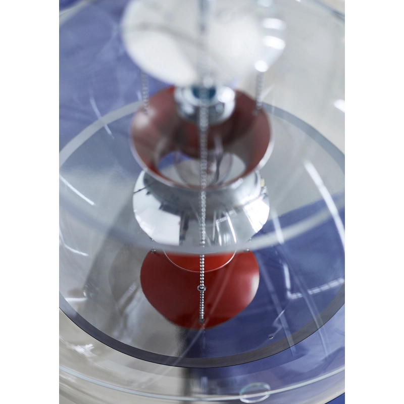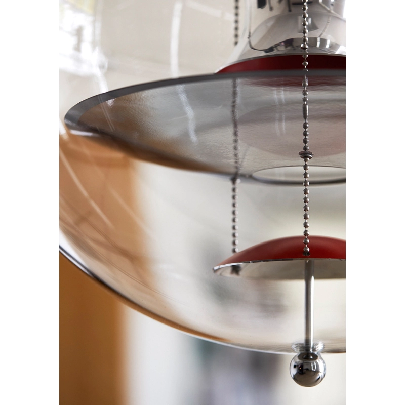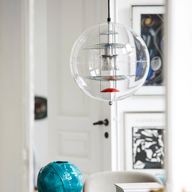 The VP Globe design suspension comprises an outer sphere in crystal-clear acrylic with five inner reflectors suspended by three steel chains. Touches of orange and blue add the finishing touch to the futuristic sculptural design and underline the unmistakable Panton design DNA. With the VP Globe, Panton's ambition was to design a lamp that could catch the eye and unite a room, whether hung alone or in clusters. This makes it an ideal choice above a dining room table, in an entrance hall or long corridor, or as a sculptural element in a corner.