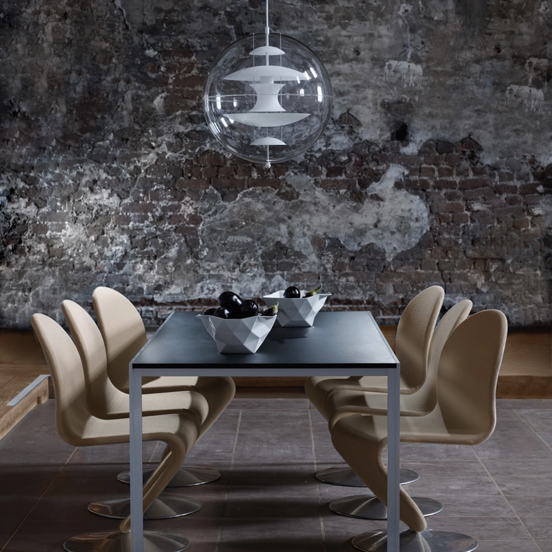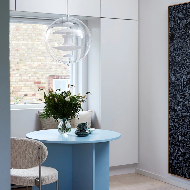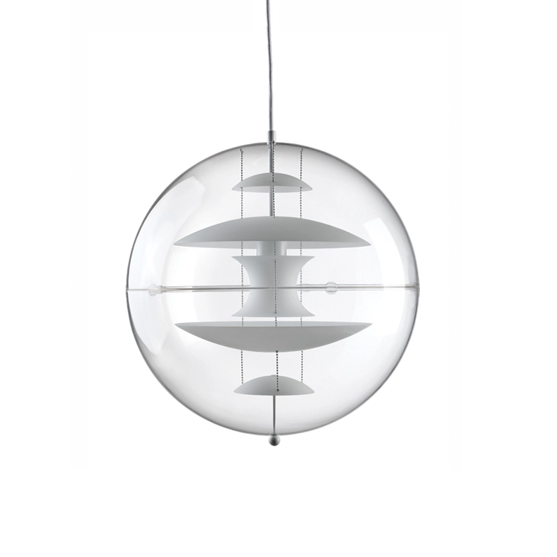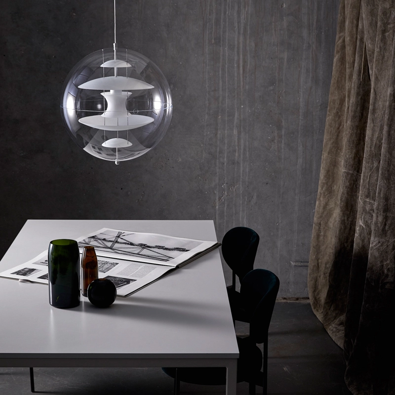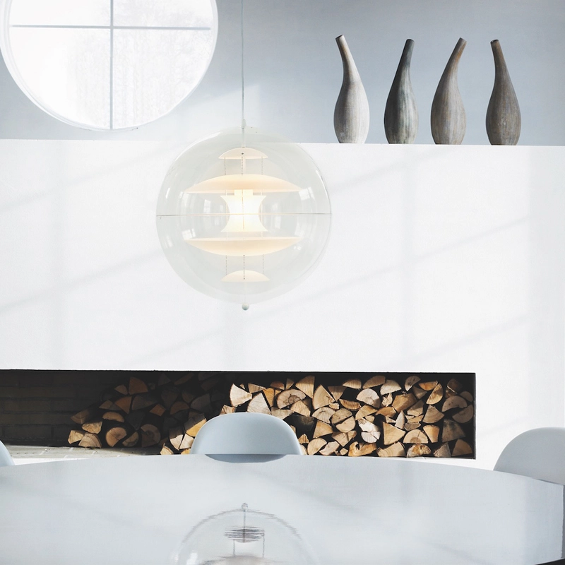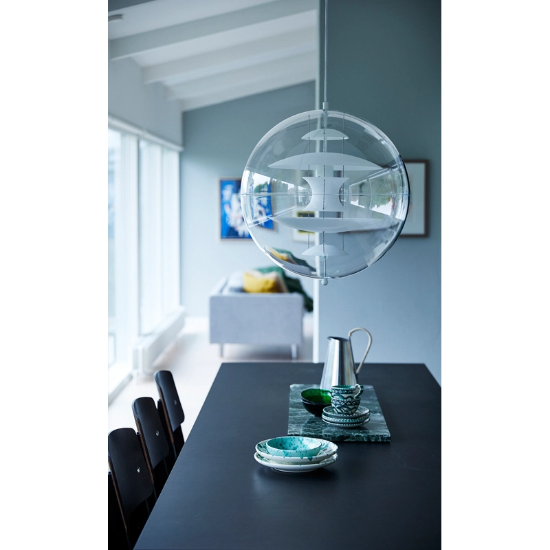 The design suspension VP Globe edited by Verpan comprises an outer sphere in crystal-clear acrylic with five inner glass reflectors suspended by three steel chains. With the VP Globe, Panton's ambition was to design a lamp that could catch the eye and unite a room, whether hung alone or in clusters. This makes it an ideal choice above a dining room table, in an entrance hall or long corridor, or as a sculptural element in a corner.
