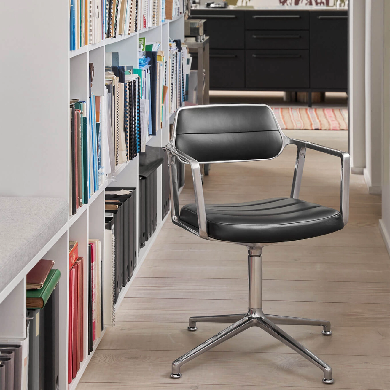 The Swivel Padded Chair 453 by Vipp expands the Swivel series by merging the generously padded seat of the Vipp453+ with the four-legged base of the Vipp452. Designed for both residential and professional settings, this chair strikes the perfect balance between long-lasting comfort, refined lines, and functional design. Its enlarged backrest and extra-padded seat provide optimal ergonomic support, making it ideal for extended hours in meeting rooms or home offices. The fixed four-legged aluminum base offers strong stability while maintaining a light and elegant silhouette. Available in high-end textiles or aniline leather carefully selected by Vipp, the Swivel Padded Chair reflects a commitment to durable and refined design. The noble materials – chrome-free full-grain leather and premium fabrics made of linen and wool – offer not only visual sophistication but also thermal and tactile comfort. “After the launch of the Swivel chair in 2021, I wished for a version that feels like sitting on a cloud,” says Kasper Egelund, CEO and third-generation owner of Vipp. With its timeless design, quality finishes, and clean yet welcoming lines, the Swivel Padded Chair stands out as an elegant solution for those seeking a meeting chair or fixed office seat that blends aesthetics and well-being. Custom upholstery options are available upon request to ensure a perfect fit within any living or work environment.
