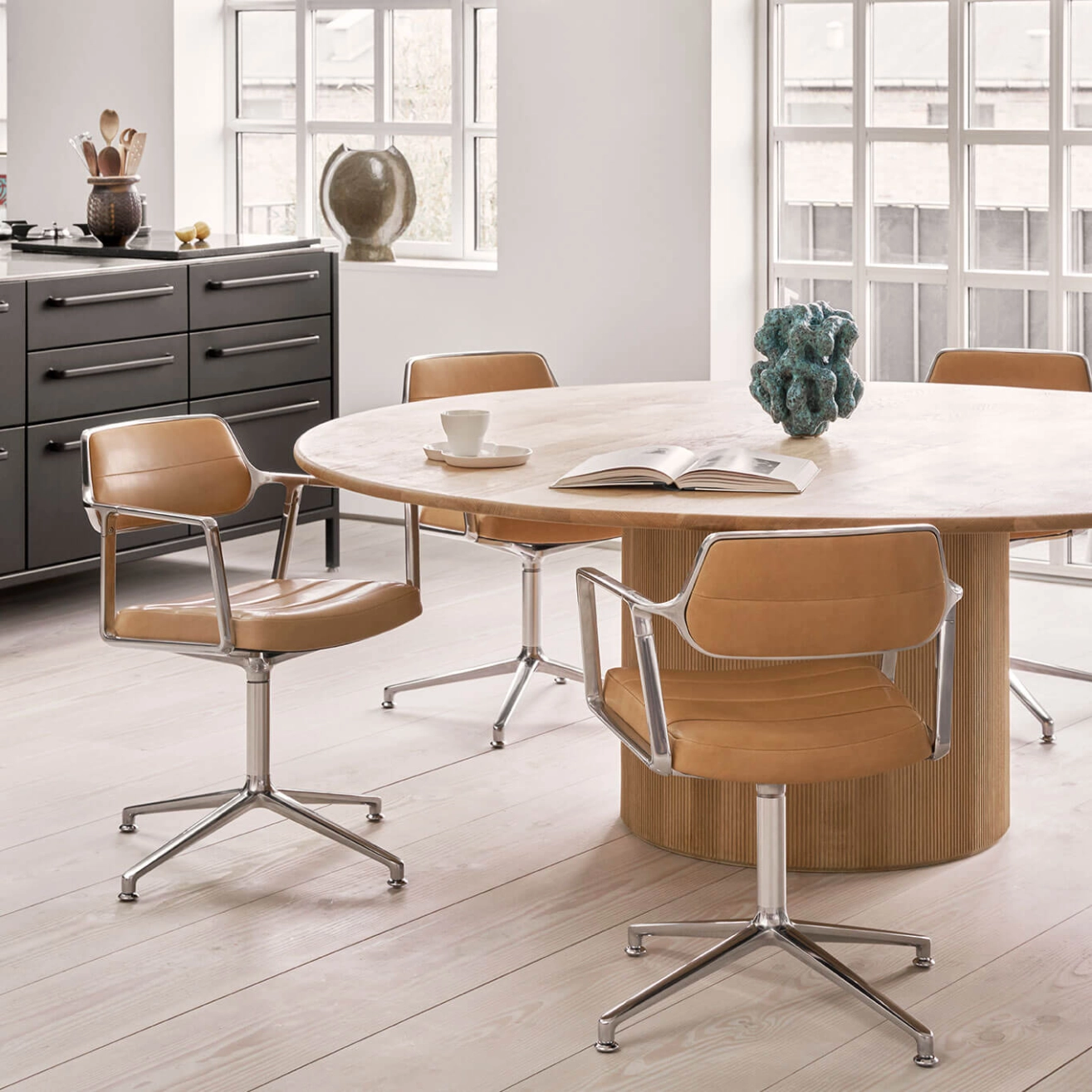 The Swivel Padded Chair 453 by Vipp expands the Swivel series by merging the generously padded seat of the Vipp453+ with the four-legged base of the Vipp452. Designed for both residential and professional settings, this chair strikes the perfect balance between long-lasting comfort, refined lines, and functional design. Its enlarged backrest and extra-padded seat provide optimal ergonomic support, making it ideal for extended hours in meeting rooms or home offices. The fixed four-legged aluminum base offers strong stability while maintaining a light and elegant silhouette. Available in high-end textiles or aniline leather carefully selected by Vipp, the Swivel Padded Chair reflects a commitment to durable and refined design. The noble materials – chrome-free full-grain leather and premium fabrics made of linen and wool – offer not only visual sophistication but also thermal and tactile comfort. “After the launch of the Swivel chair in 2021, I wished for a version that feels like sitting on a cloud,” says Kasper Egelund, CEO and third-generation owner of Vipp. With its timeless design, quality finishes, and clean yet welcoming lines, the Swivel Padded Chair stands out as an elegant solution for those seeking a meeting chair or fixed office seat that blends aesthetics and well-being. Custom upholstery options are available upon request to ensure a perfect fit within any living or work environment.