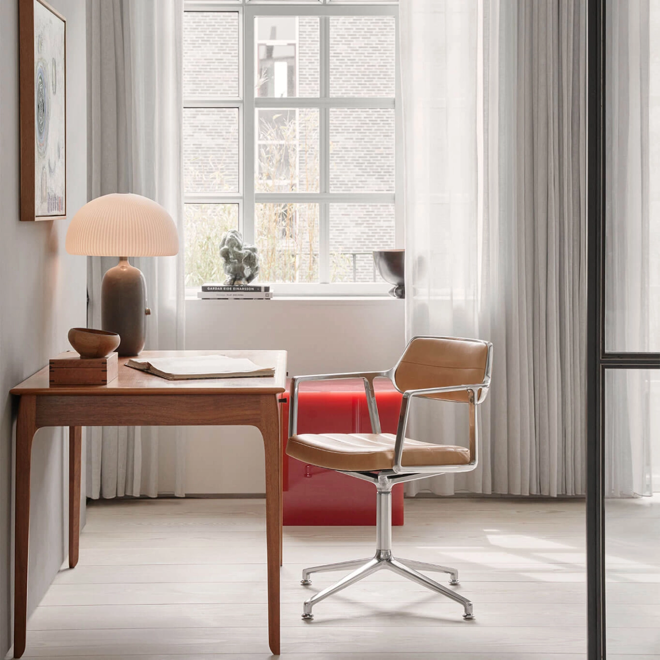 The Swivel Padded Chair 453 by Vipp expands the Swivel series by merging the generously padded seat of the Vipp453+ with the four-legged base of the Vipp452. Designed for both residential and professional settings, this chair strikes the perfect balance between long-lasting comfort, refined lines, and functional design. Its enlarged backrest and extra-padded seat provide optimal ergonomic support, making it ideal for extended hours in meeting rooms or home offices. The fixed four-legged aluminum base offers strong stability while maintaining a light and elegant silhouette. Available in high-end textiles or aniline leather carefully selected by Vipp, the Swivel Padded Chair reflects a commitment to durable and refined design. The noble materials – chrome-free full-grain leather and premium fabrics made of linen and wool – offer not only visual sophistication but also thermal and tactile comfort. “After the launch of the Swivel chair in 2021, I wished for a version that feels like sitting on a cloud,” says Kasper Egelund, CEO and third-generation owner of Vipp. With its timeless design, quality finishes, and clean yet welcoming lines, the Swivel Padded Chair stands out as an elegant solution for those seeking a meeting chair or fixed office seat that blends aesthetics and well-being. Custom upholstery options are available upon request to ensure a perfect fit within any living or work environment.