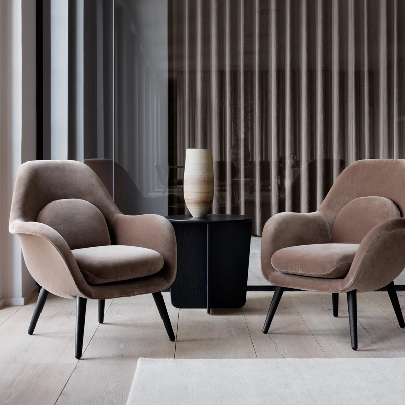 Swoon is a comfortable, sophisticated armchair designed for both communal and private spaces. Designed by Space Copenhagen for Fredericia, the armchair elegantly combines a leather- or fabric-covered shell with soft cushions. Characteristic of Space Copenhagen's work, the form of the chair is both organic and contemporary. This armchair was born out of specific needs relating to the design of modern interiors. In various hotel and restaurant projects, the designers had difficulty finding an armchair that fit perfectly, so they designed the Swoon collection. An often overlooked feature of chair design is a backrest with adequate support. Swoon has been carefully developed to provide support, while delivering an immediate sensation of relaxation.