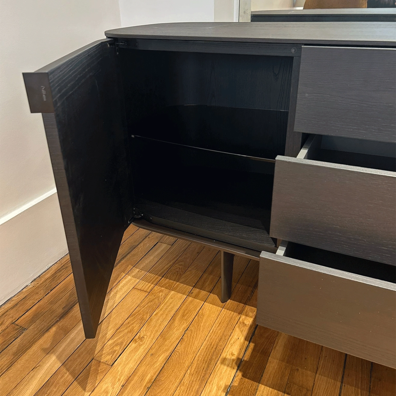 Symphony is a refined pre-owned sideboard designed by Emmanuel Gallina and produced by Poliform. This collection stands out for the essential purity of its lines, enhanced by the use of precious materials and meticulous craftsmanship. The sideboard’s elliptical shape, elevated by elegant wood finishes, lends the piece a timeless sense of harmony. Available in various heights and configurations, from tall and medium versions with doors to low models featuring drawers or open compartments, the Symphony collection perfectly balances aesthetic sophistication and contemporary functionality.