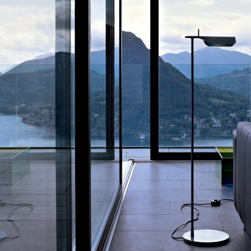 Created by Edward Barber and Jay Osgerby, Tab F is a floor lamp providing direct lighting. The head is adjustable thanks to a small handle on the top of the lamp that prevents burning. The head, gaskets and base of Tab F are made of die-cast aluminium, while the reflector is made of porcelain. Its simple and modern lines make it a perfect reading light in the living room or bedroom. Produced by Flos, TAB T lamp is available in black and white.