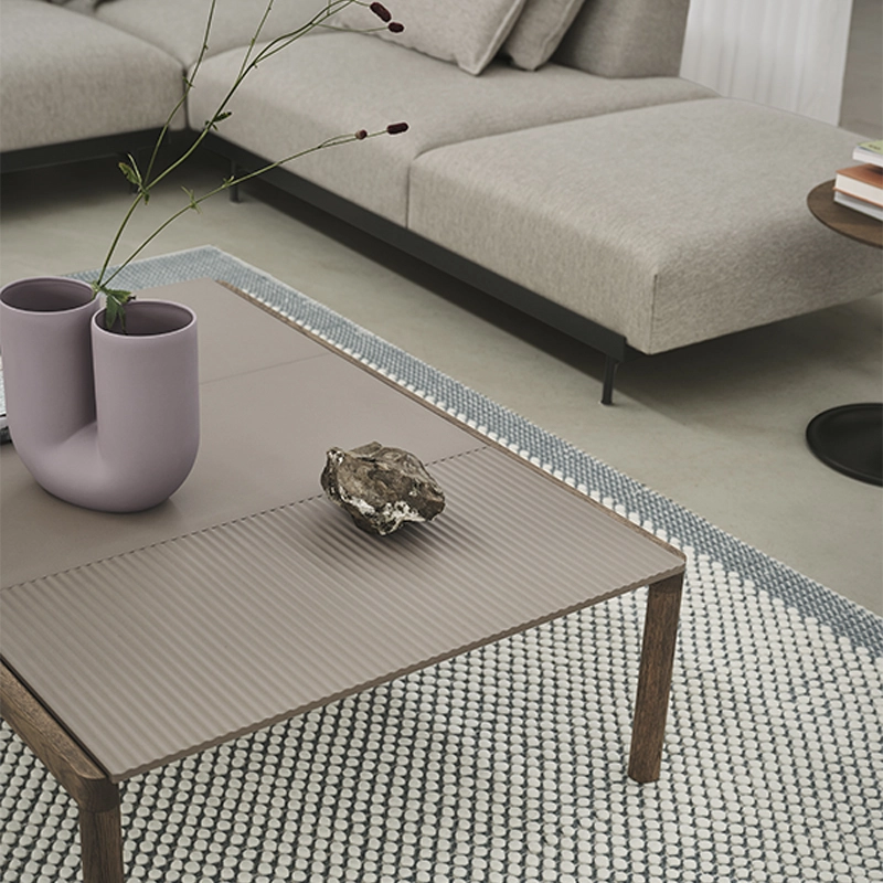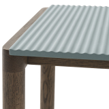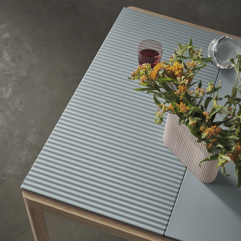 The Couple coffee table is made up of large rectangular tops available in two different finishes: smooth or corrugated. The assembly of the tops of the Couple de Muuto low table allows a play of textures, alternating smooth surfaces and surfaces sculpted by undulations that form slight reliefs, tracing strong, sculptural lines.