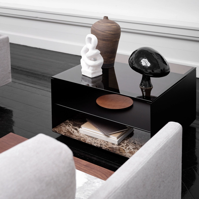 Expose is a multifunctional furniture concept somewhere between a coffee table, a podium or a pedestal, in short a new way of displaying objects in the home. In designing this collection, Jonas Wagell wanted to create a table with clear lines, made from exclusive materials, on which you can display works of art and design objects, but also hide things you don't want to see.  The smoked glass top rests on a steel frame, while a marble slab at the base provides balance and stability. Between the top and the base, a steel shelf reinforces the whole and provides storage space. The shelf, which is two-thirds the size of the table, allows you to store larger objects on one side, such as books. Available in three sizes, these graphic and elegant tables, published by Wendelbo, can be used separately or in dynamic compositions.